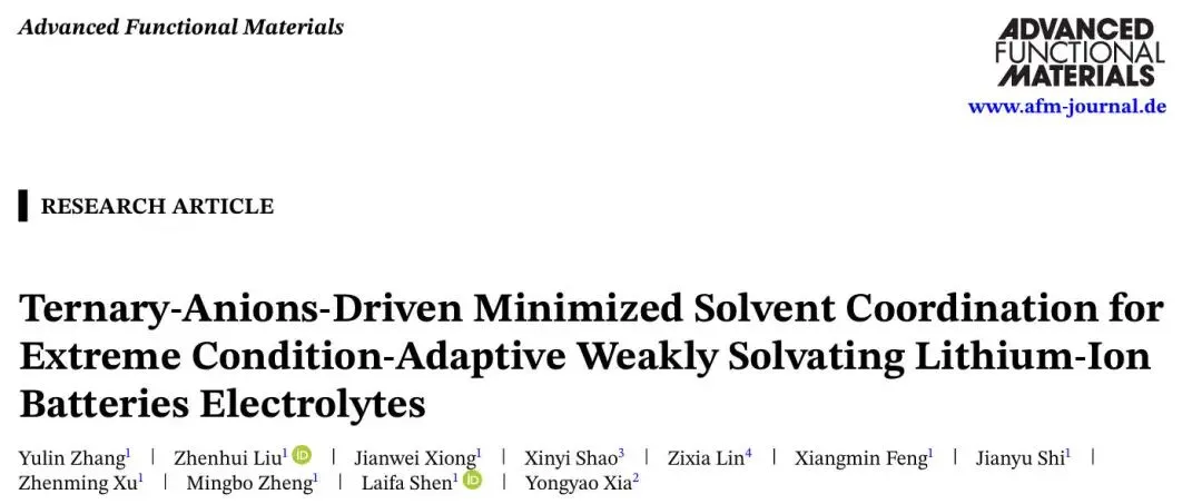 Ternary‐Anions‐Driven Minimized Solvent Coordination for Extreme Condition‐Adaptive Weakly Solvating Lithium‐Ion Batteries Electrolytes, Advanced Functional Materials 2025 DOI: 10.1002/adfm.202529170