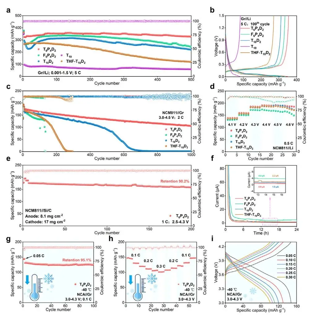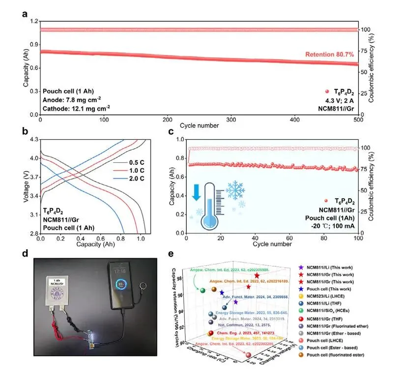 该电解液在NCM811//Gr电池中同时实现了优异的快充性能(6 C倍率下循环2000次后容量保持率为76.8%)和出色的低温性能(-40°C下循环100次后容量保持率为95.1%)。此外,它还在实际NCM811//Gr软包电池中实现了500次稳定循环,并在NCM811//Si/C电池中表现出极具竞争力的性能。