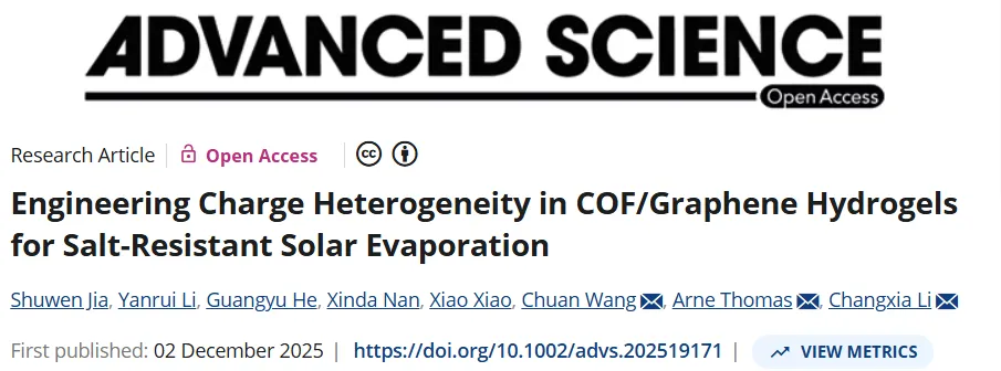 本工作针对太阳能界面蒸发技术在高盐环境中面临的盐积累、蒸发效率衰减等关键问题,创新提出异质电荷 COF/石墨烯水凝胶设计。通过将阳离子 COF(C-COF)与阴离子 COF(A-COF)以精准比例在石墨烯网络中实现纳米尺度空间分离,构建出电荷分布可控的异质电荷水凝胶(HCG),既解决了传统 COF 粉末加工性差、缺乏宏观连通性的缺陷,又突破了两性离子水凝胶电荷调控精度不足的局限,借助空间离子选择性作用促进中间水形成、降低蒸发焓,实现高盐环境下更优异的蒸发性能与抗盐稳定性。