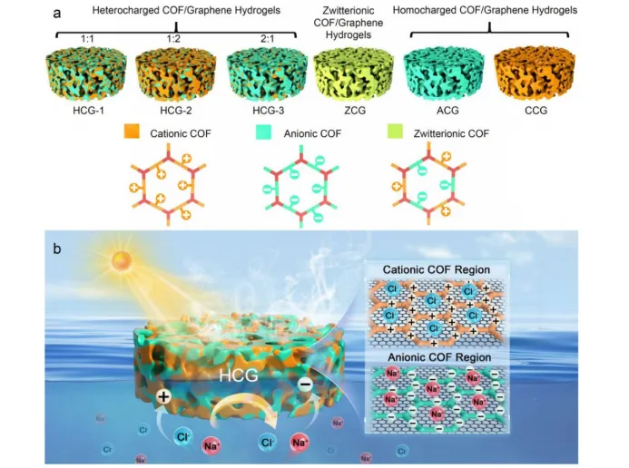 图1.a)具有不同电荷类型的COF/石墨烯水凝胶(CGs)的结构示意图。b)异质电荷COF/石墨烯水凝胶(HCG)蒸发器的示意图。石墨烯网络中非均相分布的C-COF和A-COF促进了选择性离子相互作用,这种空间离子调节增强了IW的形成,减少了盐的结晶,并促进了盐分环境中稳定、高效的蒸发