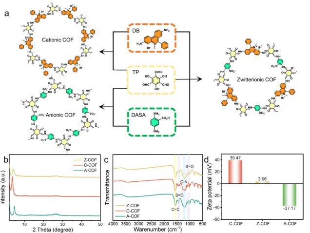 图2.a) C-COF、A-COF和Z-COF的合成方案。b) C-COF、A-COF和Z-COF的XRD图谱,c) FTIR 光谱和d) zeta电位