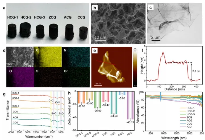 图3.a) COF/石墨烯水凝胶(CGs)的实物照片。b) HCG-1的SEM图像和c) TEM图像。d) HCG-1的SEM图像及相应的EDS能谱图。e, f) HCG-1的AFM图像及相应的高度分布图。g) CGs的FTIR 光谱图,h) zeta电位和 i) UV–vis- NIR 光谱图