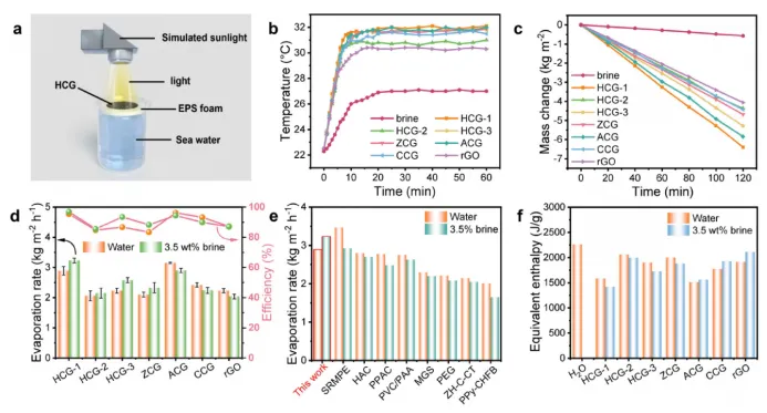 图4.a) 水蒸发实验装置示意图。b, c) CGs在1个太阳光照下, 3.5 wt.% 盐水中随时间变化的温度与质量变化曲线。d) CGs在1个太阳光照下的水蒸发速率与能量效率。e) HCG-1在纯水与3.5 wt.% 盐水中的蒸发速率与已有研究报道材料的对比。f) 差示扫描量热法(DSC)测定的CGs蒸发焓数值学