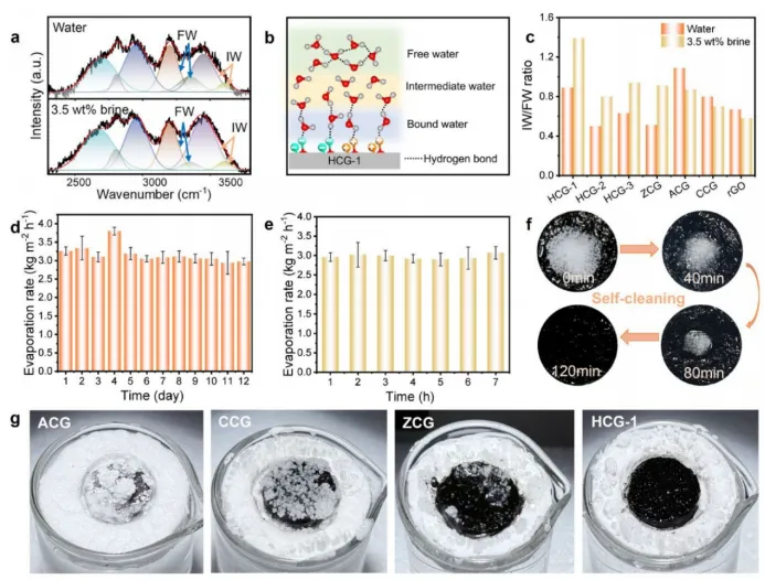 图5.a) HCG-1在纯水和3.5 wt.% 盐水中的拉曼光谱。b) 水凝胶网络中水分子存在形态的示意图。c) 不同CGs中中间水(IW)与自由水(FW)的比例。d) HCG-1在3.5 wt.% 盐水中的12天稳定性测试。e) HCG-1在1个太阳光照下在真实海水中的蒸发速率。f) HCG-1表面盐颗粒随时间溶解的照片。g) 在1个太阳光照下,ACG 、CCG、 ZCG 和HCG-1在20 wt.%盐水中连续蒸发12小时后的照片