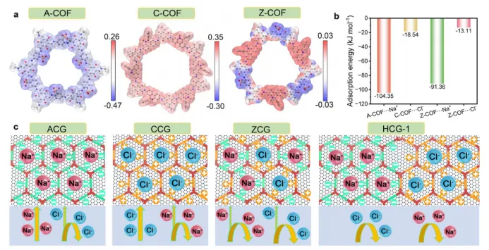图6.a) A-COF、C-COF和Z-COF的ESP分布图。 b) A-COF、C-COF和Z-COF对Na⁺/Cl⁻吸附能。 c) ACG 、CCG、 ZCG 和HCG-1的抗盐机理示意图