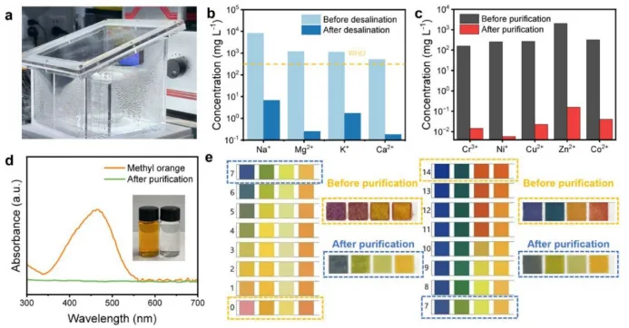 图7.a) 水收集装置的实物照片。 b) 海水淡化前后的离子浓度变化。 c) 污水净化前后的重金属离子浓度变化。 d) 染料污染水与净化水的紫外-可见光谱及实物照片。 e) 强酸性与强碱性水溶液的净化能力对比