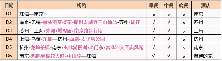 游览:【樱花大道】鸡鸣寺路樱花大道是南京最浪漫的赏樱地之一。每当樱花盛开之时,道路两旁的樱花树仿佛被施了魔法,满树的粉色花瓣如云似霞,微风轻拂,花瓣纷纷扬扬地飘落,宛如一场浪漫的花雨。漫步在樱花大道上,仿佛走进了一个童话世界,空气中弥漫着淡淡的花香,让人陶醉其中。沿着樱花大道前行,还能看到古朴典雅的鸡鸣寺。这座千年古刹在粉色樱花的映衬下,更显庄严肃穆又不失浪漫气息。寺庙的红墙与粉色樱花相互交织,构成了一幅绝美的画面,吸引着众多游客驻足拍照留念。(行程备注:若樱花大道花期已过,则调整为前往梧桐大道(陵园路),感受林荫风光。无费用可退,请知悉~~)在这里,既能感受自然美景的浪漫,又能体验到历史文化的厚重和美食带来的满足,为这次江南之旅画上一个完美的句号。游览结束后,收拾好心情,带着满满的回忆,乘车前往机场,返回温馨的家。