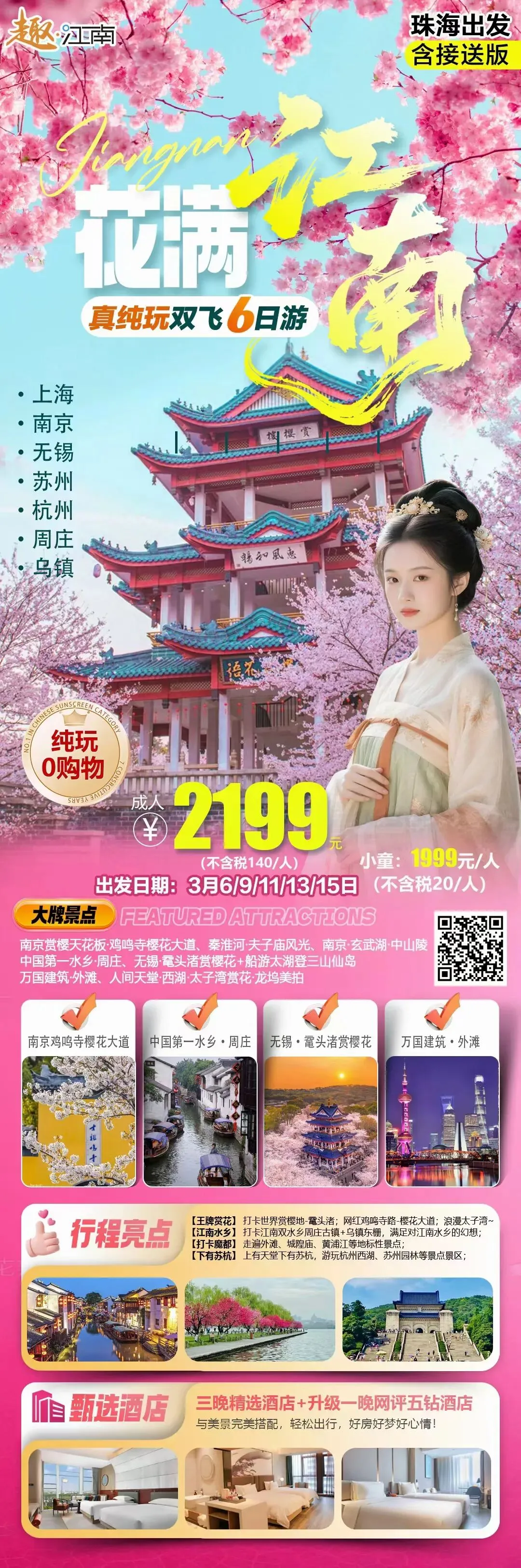 南京赏樱天花板·鸡鸣寺樱花大道、秦淮河·夫子庙风光、南京·玄武湖·中山陵中国第一水乡·周庄、无锡·鼋头渚赏樱花+船游太湖登三山仙岛万国建筑·外滩、人间天堂·西湖·太子湾赏花·龙坞美拍双飞 6 天纯玩无购物<三晚精选酒店+升级一晚网评五钻酒店+水乡+园林+专车专导管家服务>士产品特色。