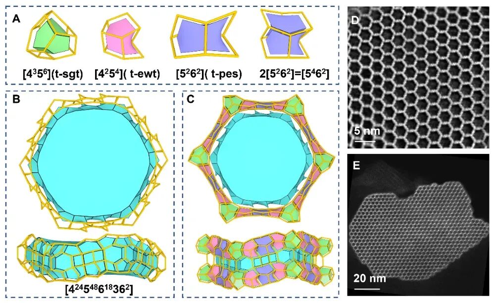 图2:NJU120-6的拓扑结构单元拼接方式及36元环孔道的电子显微镜实证。