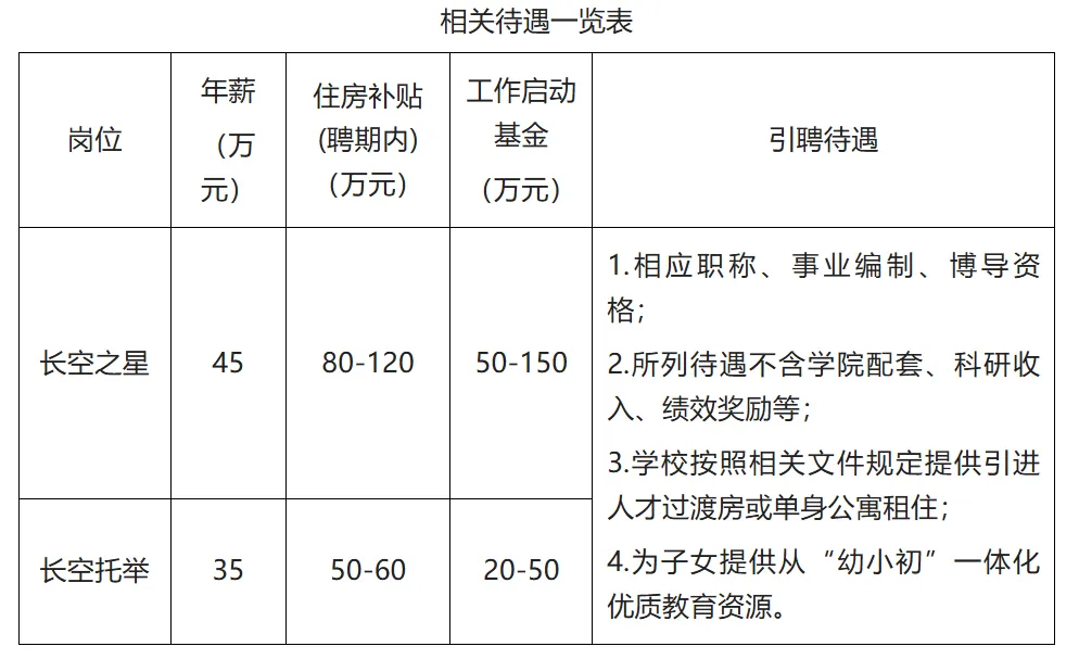 博士毕业两年以上,应达到学校正高岗位教学科研水平或在副高岗位任职三年以上,在“长空之星”培养期内有望达到国家级青年人才教学科研水平。自然科学和工程技术类申请者年龄一般不超过35周岁,人文社会科学类申请者年龄一般不超过38周岁。