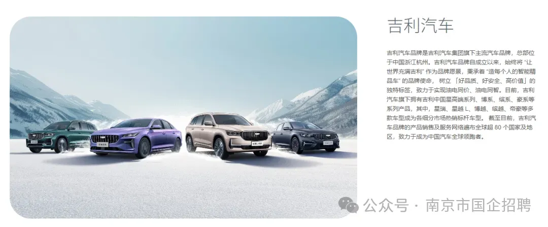吉利控股集团以“引领绿色智能通行生态”为愿景,致力于以创新的绿色智能科技,为用户提供“可油可电可醇”的卓越产品与灵活能源服务,推进“安全放心、普惠平权”的智能出行与运输解决方案,引领“绿色低碳、智能共享、乘商互联、天地一体”的通行生态。集团业务涵盖汽车及上下游产业链、智能出行服务、绿色运力、醇氢生态、数字科技等;旗下乘用车品牌“吉利、吉利银河、领克、极氪、沃尔沃、极星、莲花”,新能源商用车品牌“远程”等围绕各自品牌定位,依法合规地积极参与全球市场竞争。集团以汽车产业电动化和智能化转型为核心,坚定在新能源科技、三电技术、人机交互、辅助驾驶、车载芯片、低轨卫星等前沿技术领域投入,打造科技护城河,做强科技生态圈,并积极发展新质生产力,持续探索通过绿色甲醇来破解世界能源和双碳难题,积极推进 2045 年实现全产业链碳中和目标。