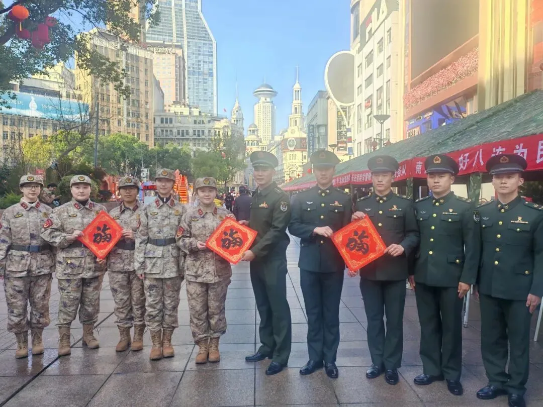 现场最暖心的一幕,当属女子民兵连的队员们捧着大红福字,快步走到“南京路上好八连”的服务桌前。“八连的老班长们,给您拜年啦!”随着一声清脆的祝福,队员们将福字递到好八连队员手中,两个单位的队员们随即并肩而立,手举福字共同合影,鲜红的福字映着一张张笑脸,成了南京路步行街上最动人的新春风景。