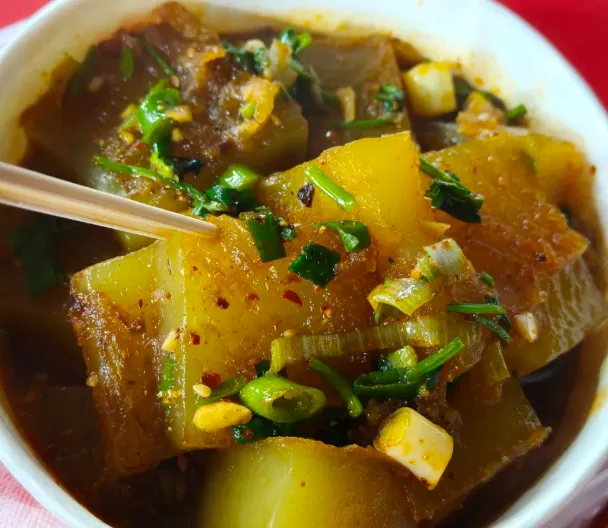 到了中午和晚上,自然是海鲜的主场。不是那种摆盘精致的法式料理,而是那种脸盆大的盘子端上来,皮皮虾(这里叫爬爬虾)还在蹬腿。还有一道不得不提的街头小吃——连云港凉粉。