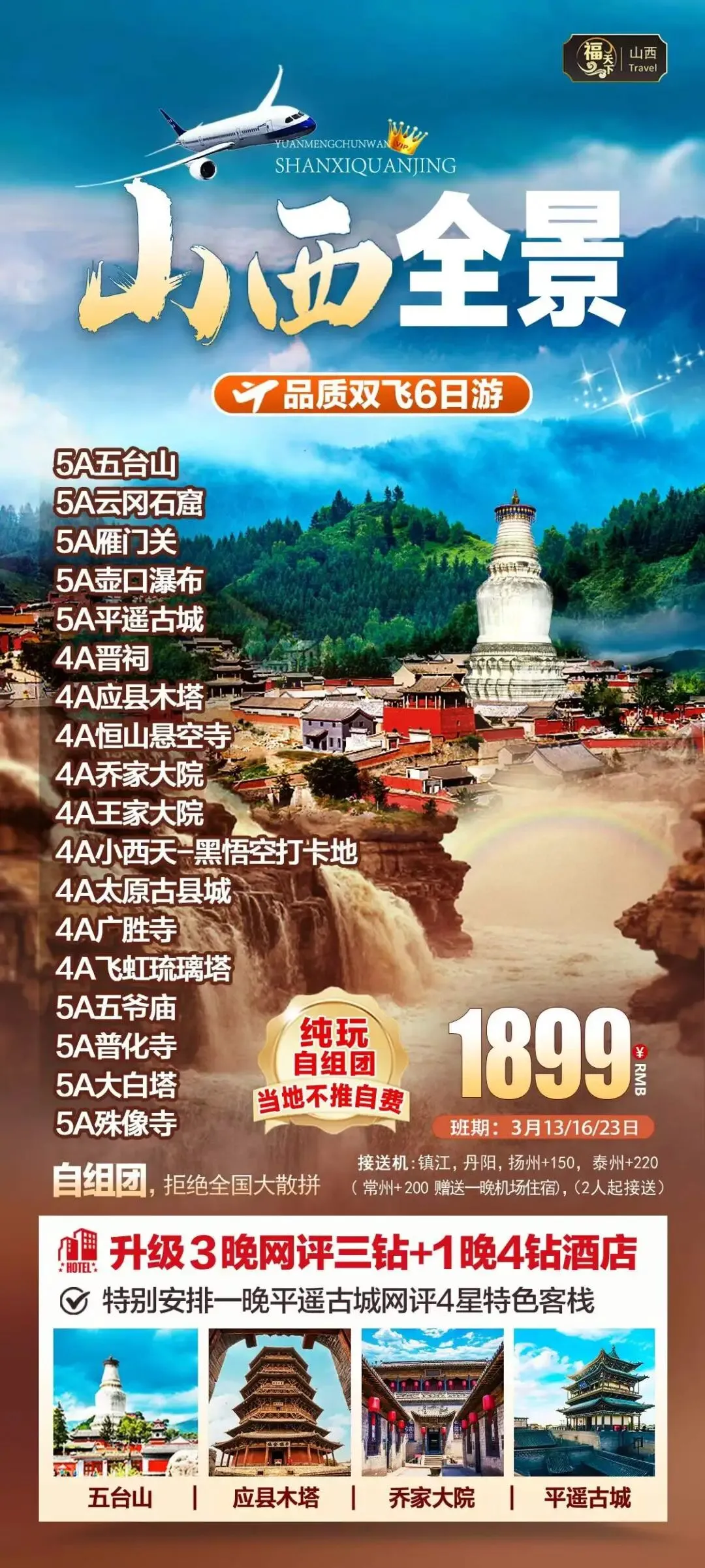 🔥 应县木塔+五台山+壶口瀑布+平遥古城+王家大院+乔家大院+云冈石窟+雁门关+晋祠等山西精华景点一次游遍,不留遗憾!