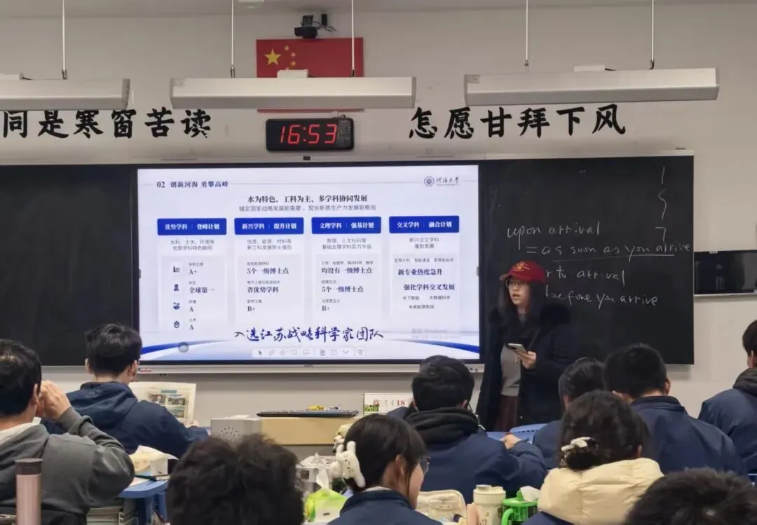 走进熟悉的校园,与恩师重逢时的温馨畅谈,让我们更懂感恩与传承——昔日恩师的谆谆教诲,如今已化作我们前行的力量,而此次宣讲,正是我们将这份力量传递下去的契机。进班宣讲时,学弟学妹们眼中的好奇与向往,让我们更加珍视“学长学姐”这一身份带来的责任。分享河海大学的王牌学科与校园生活时,我们不仅是学校的“代言人”,更是梦想的“传递者”;倾囊相授备考干货、解答学习困惑时,那些曾经支撑我们走过高中岁月的经验与感悟,在传递中被赋予了新的意义。
