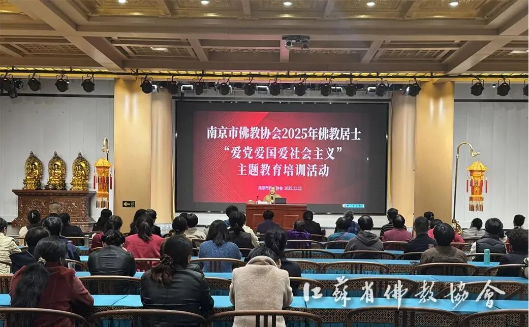 为深入学习贯彻党的二十届四中全会精神,全面落实全国及全省佛教界“学法规、守戒律、重修为、树形象”教育活动要求,11月11日,南京市佛教协会在浦口惠济讲寺举办2025年城北片区居士“爱党爱国爱社会主义”教育培训活动。来自南京市江北新区、浦口、六合三区近80名居士代表参加培训。市佛教协会会长传静法师出席开班仪式并作动员讲话。