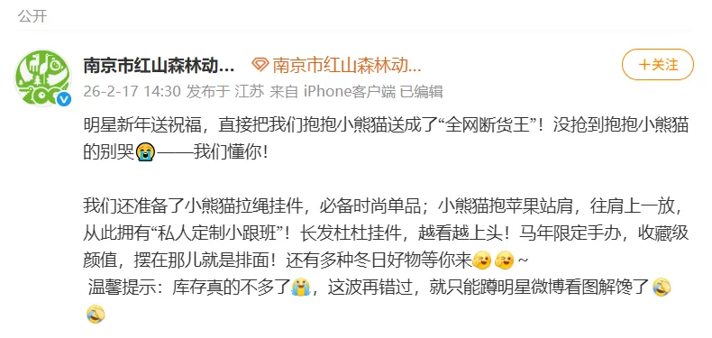 对此,南京市红山森林动物园官方回应:库存真的不多了,但是还准备了小熊猫拉绳挂件、小熊猫抱苹果站肩、长发杜杜挂件等文创产品,欢迎大家选购。