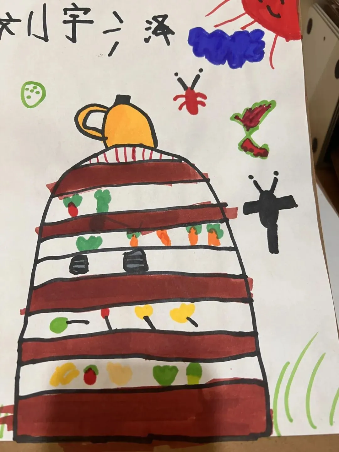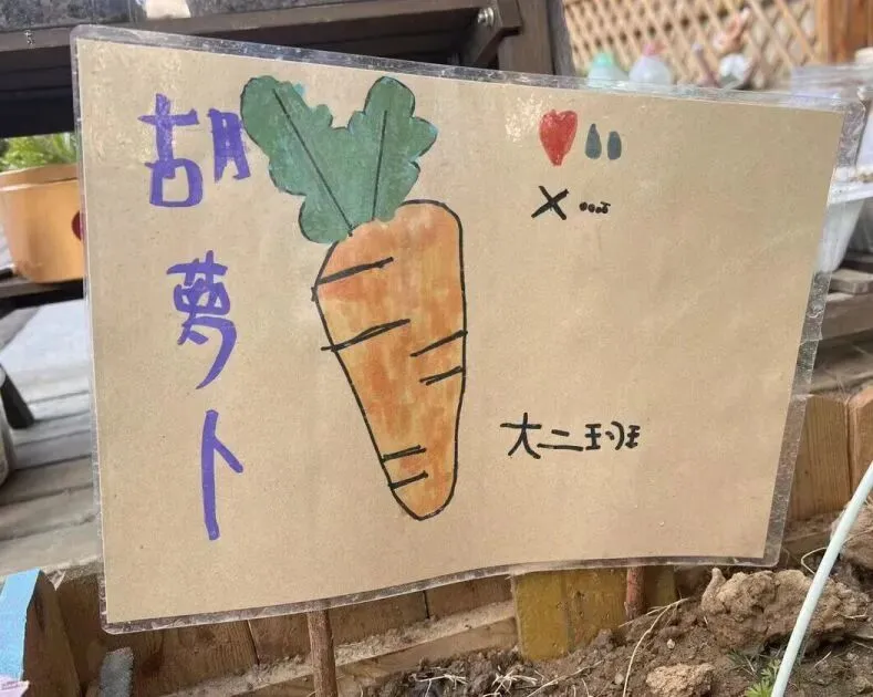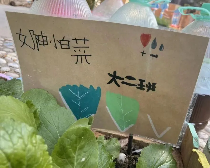 大家一起给菜地设计了漂亮的标识牌,不仅写明了蔬菜的名称,还把日常照顾的注意点标注了上去。