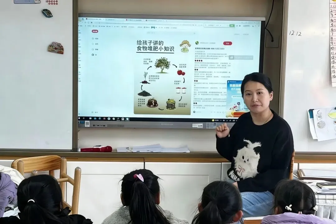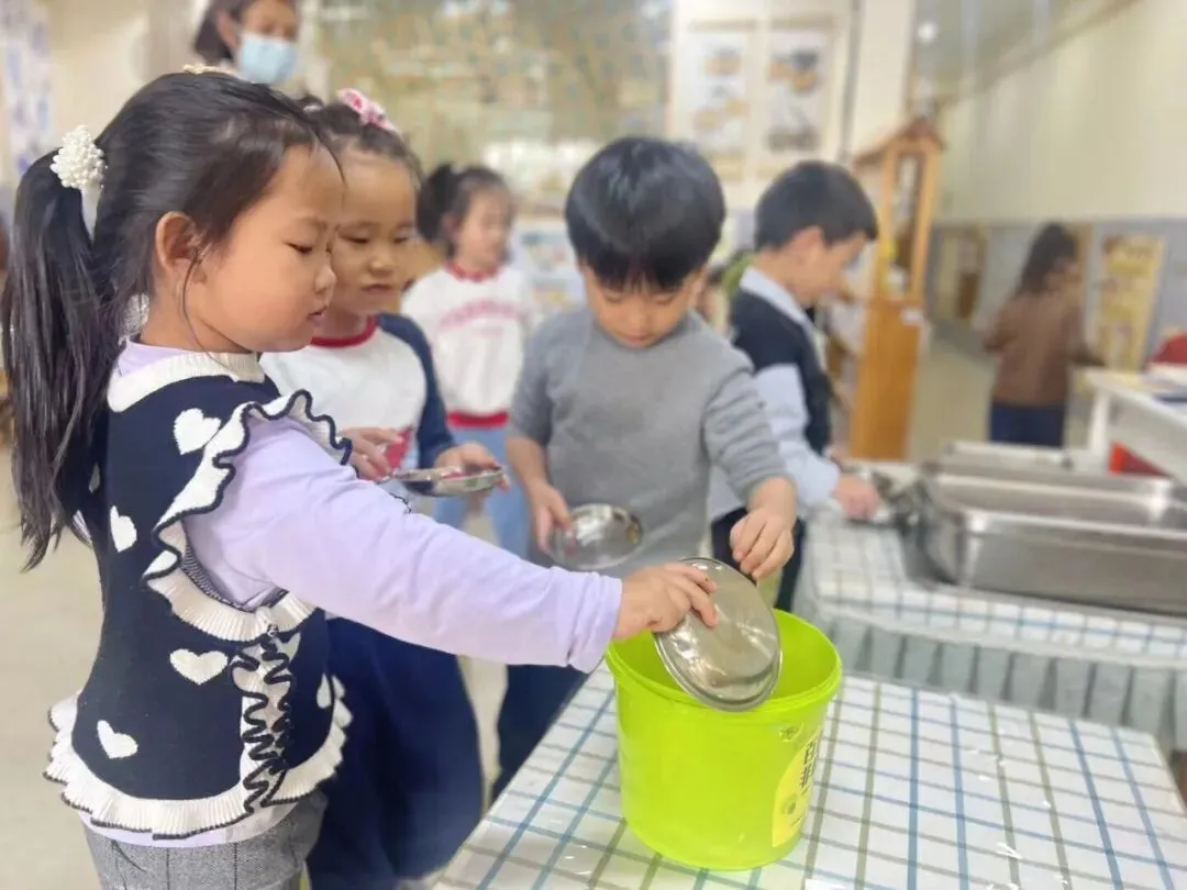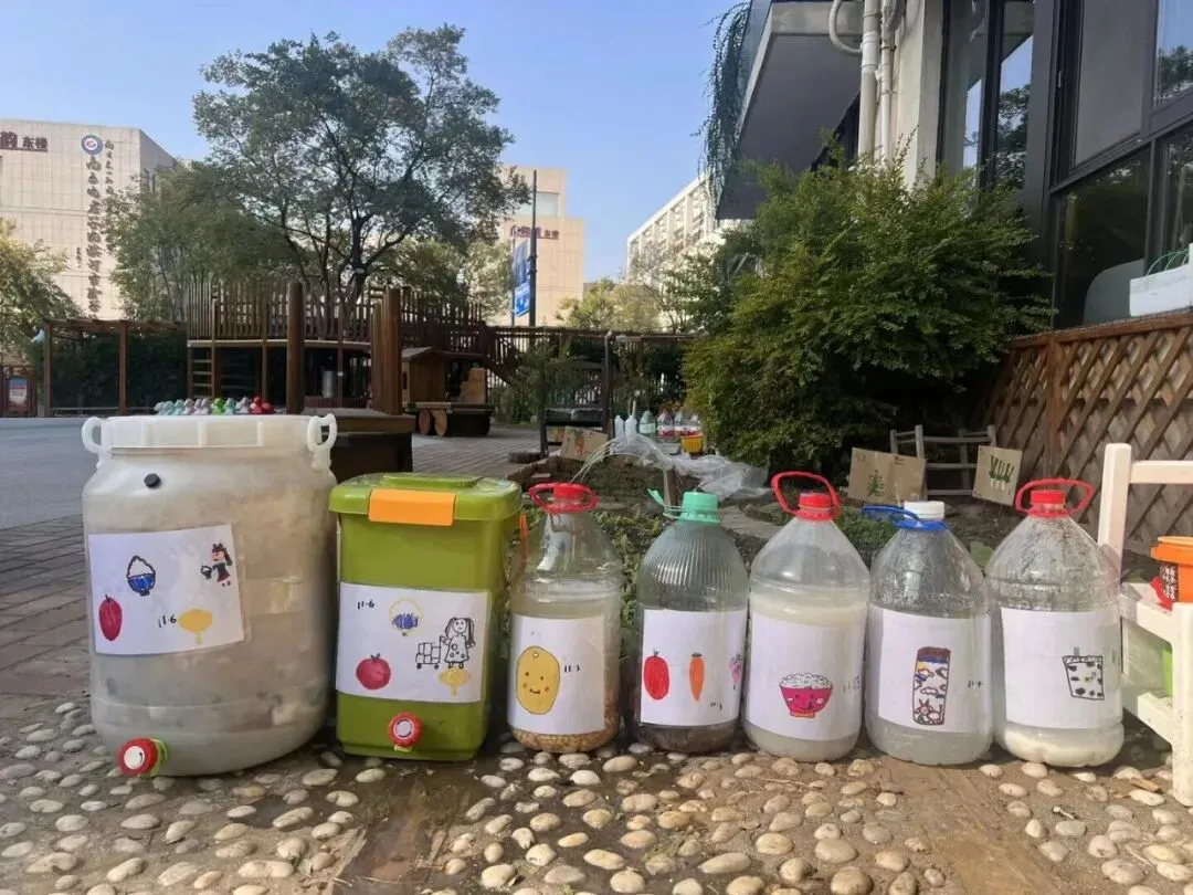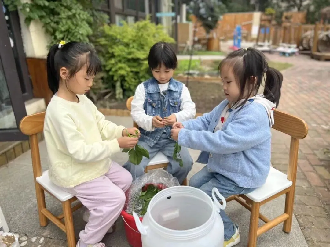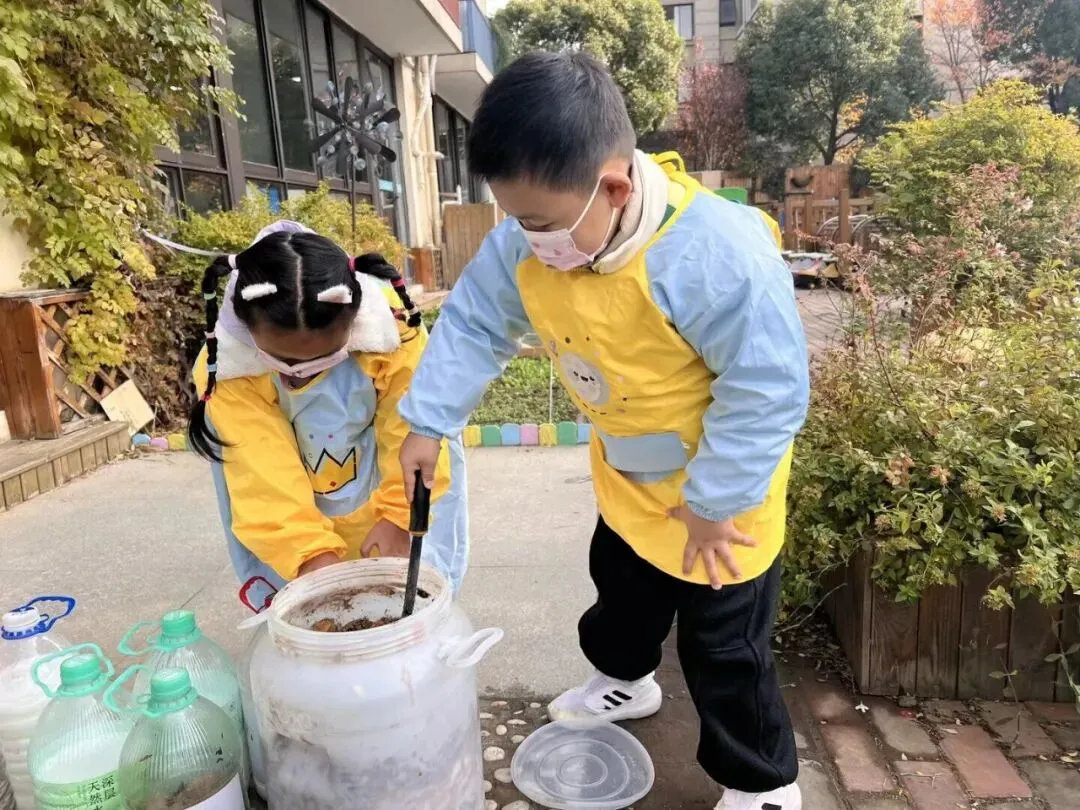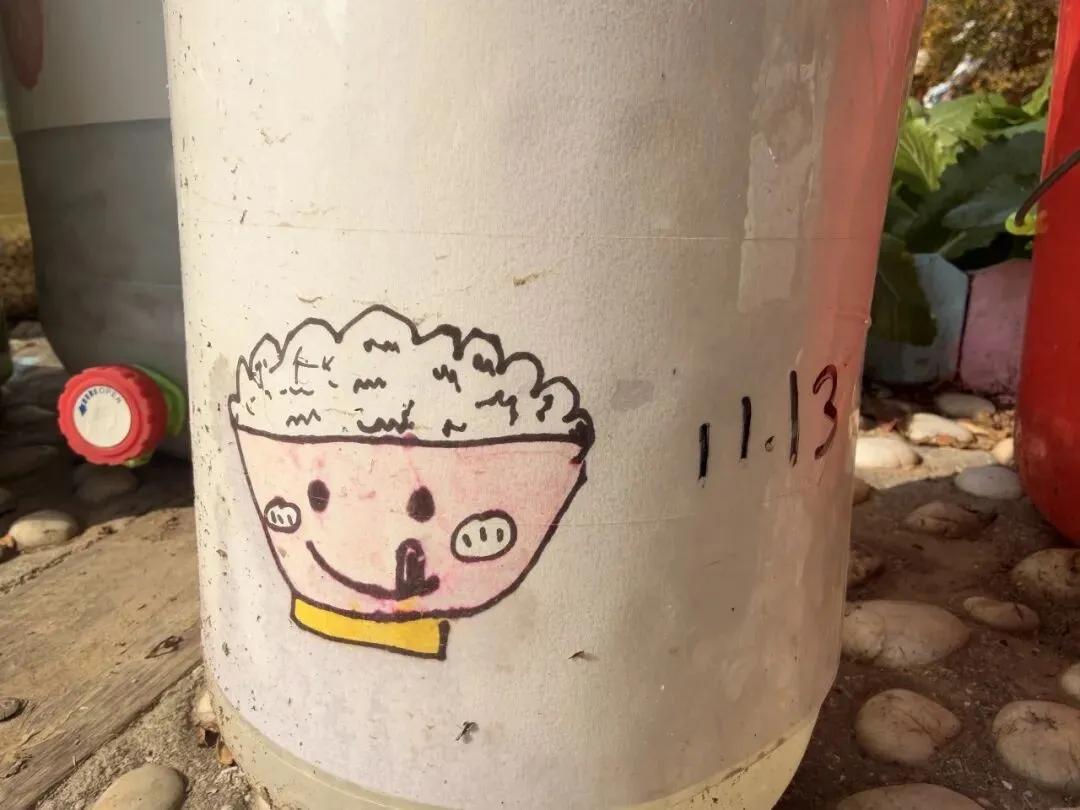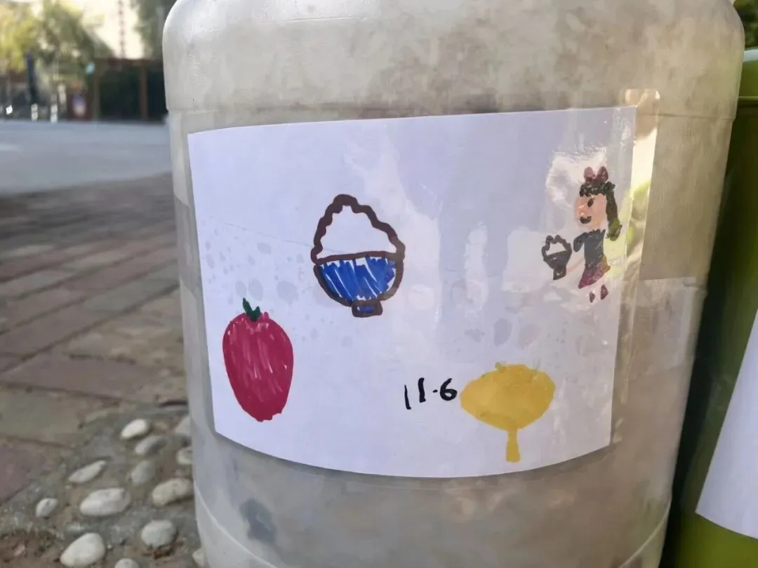 大家收集了落叶、点心吃剩的果皮、向食堂叔叔阿姨要来不要的菜叶,一起尝试用堆肥桶进行堆肥。