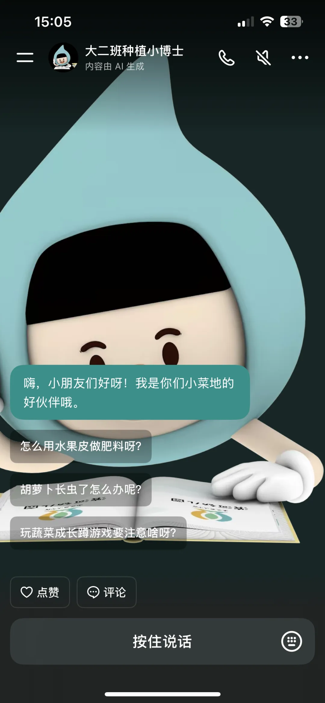 在种植的过程中,不仅孩子们遇到了问题,对于没有种菜经验的老师来说也充满了挑战。为了更好的开展种植活动,我们通过人工智能创建了“大二班种植小博士”智能体。孩子们通过和智能体的对话,就能快速获得答案以解决问题。