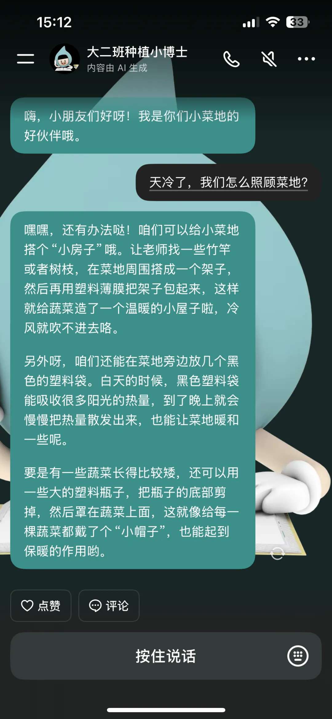 那么到底怎么做呢?大家通过询问智能体和共同商议最终决定给蔬菜盖上大棚,这样天冷也不怕蔬菜冻着了!