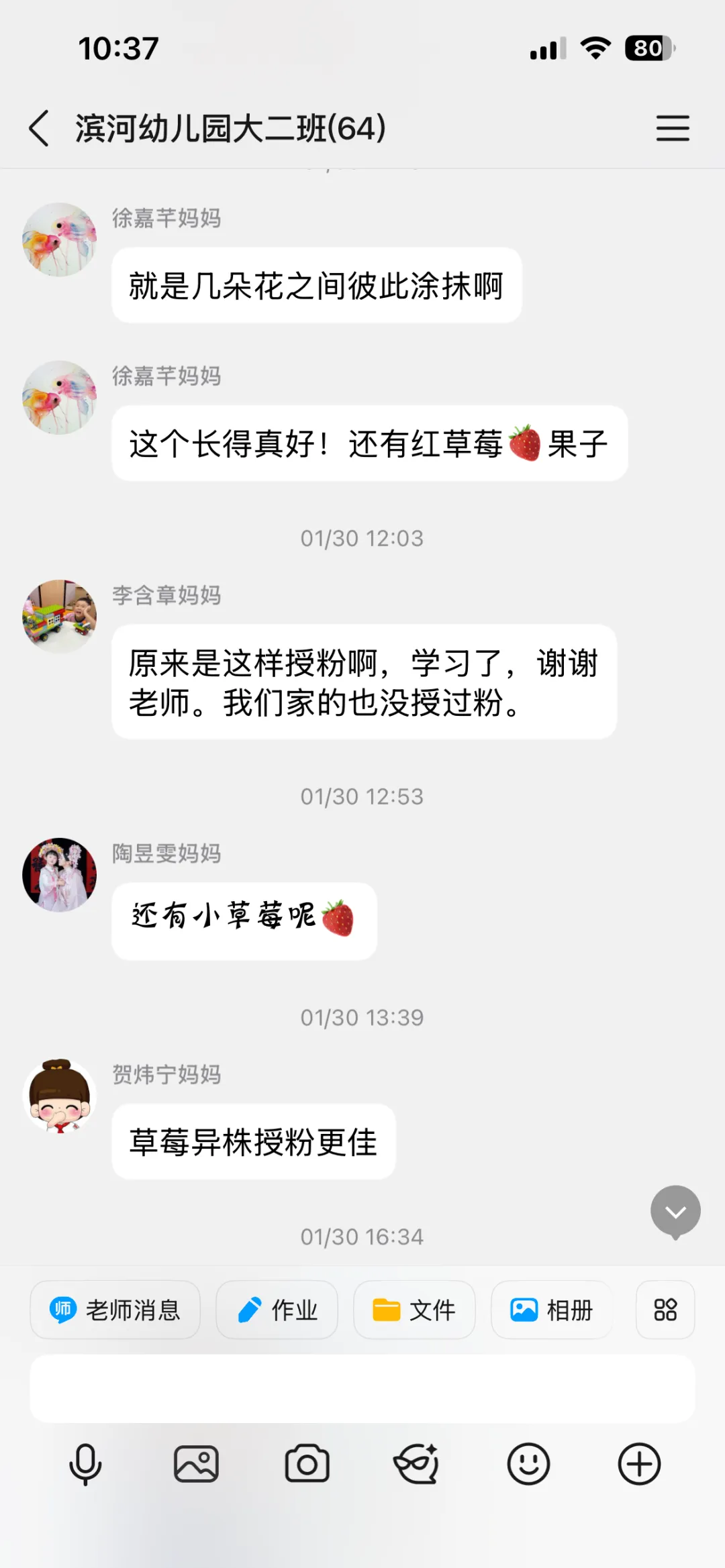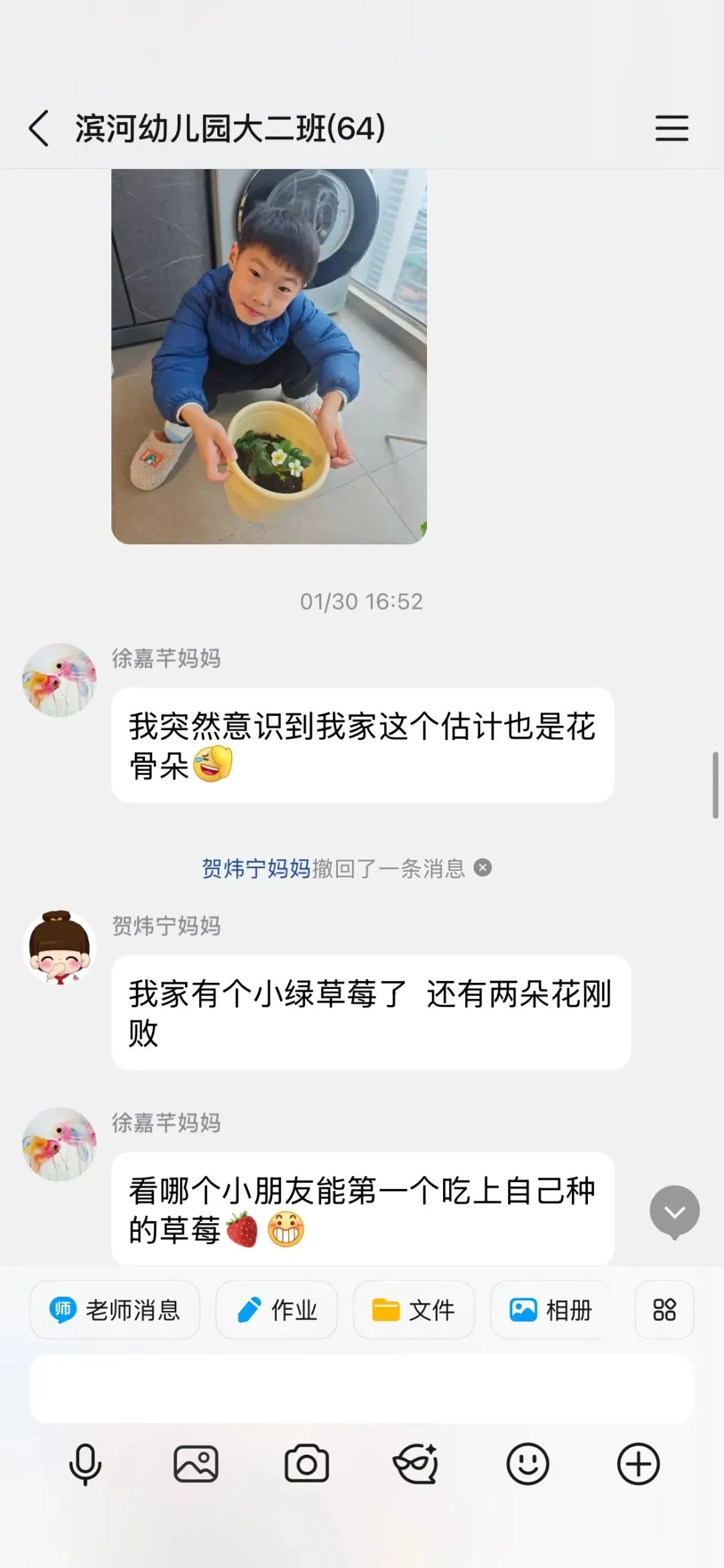 家长们也经常在群中交流领养的蔬菜和小草莓苗的变化,交流经验。