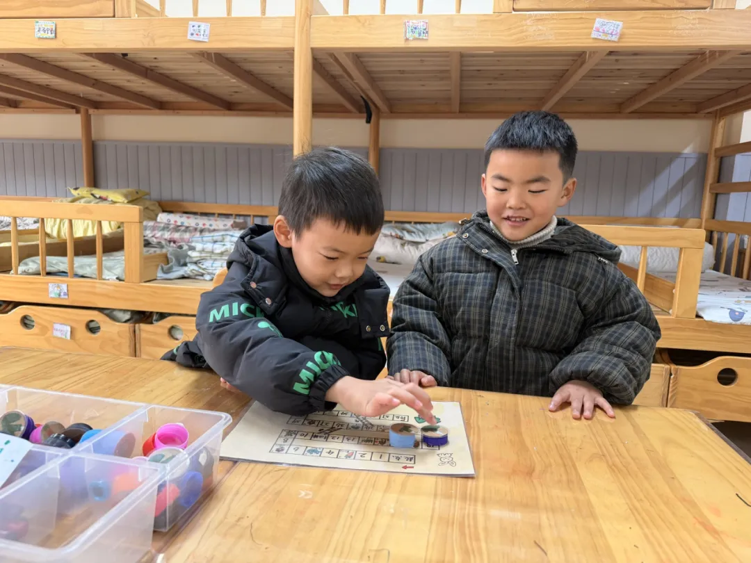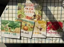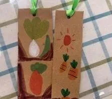 种植活动的经验也慢慢渗透在孩子们的游戏活动中。小朋友们一起阅读种植绘本,制作了精美的小菜地书签,自制了小菜地游戏棋。