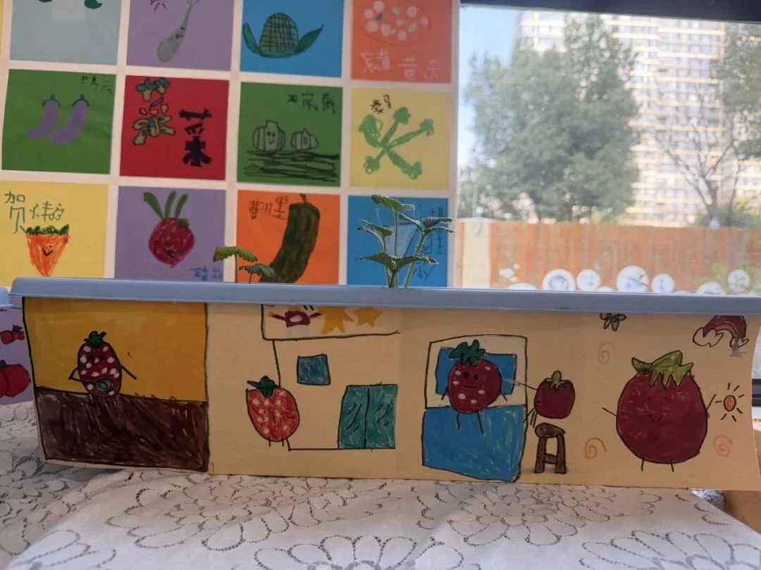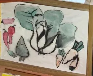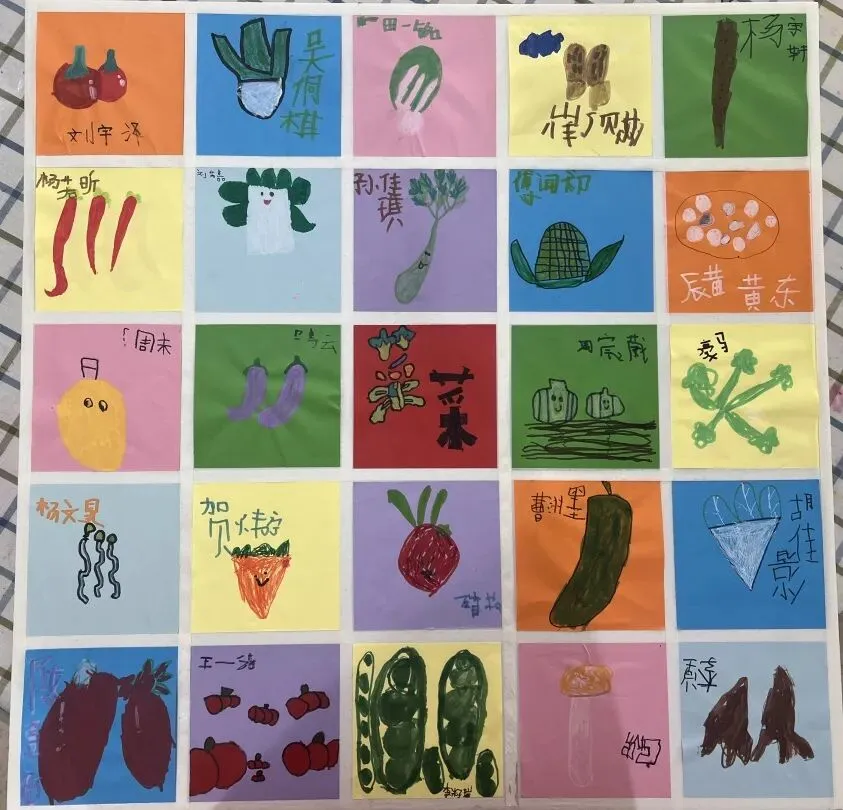 在种植过程中,孩子们认真观察了蔬菜宝宝的特征,并在此基础上进行艺术创作,制作蔬菜撕贴画,合作了五颜六色的百菜图和蔬菜水墨画。