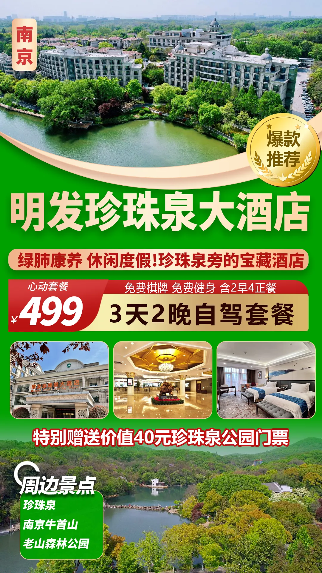 499元3天2晚住【南京明发珍珠泉大酒店】含2早餐4正餐,珍珠泉公园门票免费送,棋牌、健身、台球等免费玩,绿肺康养,休闲度假~~