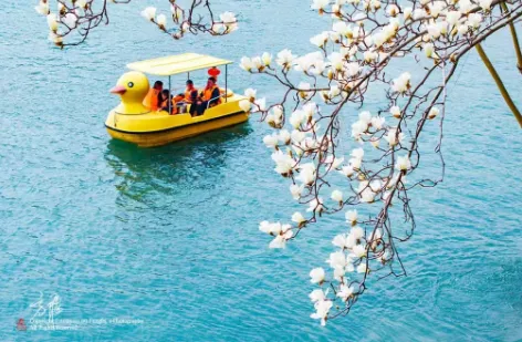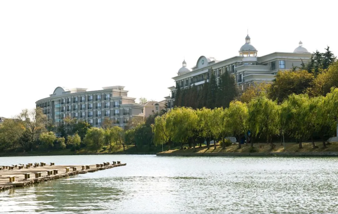酒店建筑呈半弧形环绕泉水,与湖光山色融为一体,四季景色各异:春季桃红柳绿,夏季林木葱郁,秋季层林尽染,冬季红梅傲雪。