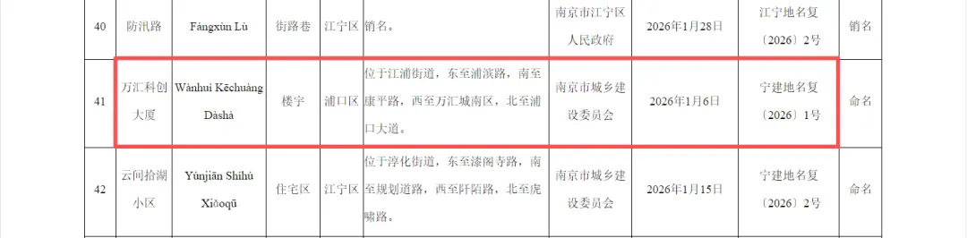 近日南京官方网站发布了2026年首期地名公告,其中在浦口区出现了一处名为“万汇科创大厦”的新楼宇!