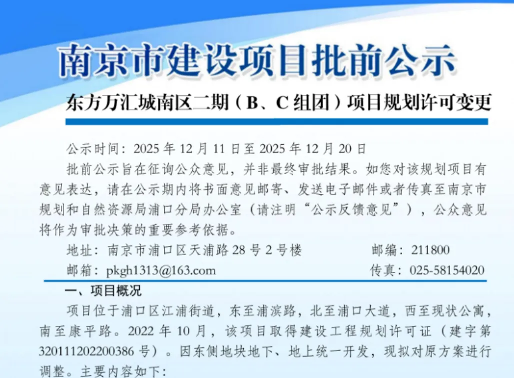 规划显示,东方万汇城南区位于浦口区江浦街道,东至浦滨路,北至浦口大道,西至现状公寓南至康平路。2022年10月,该项目取得建设工程规划许可证(建字第320111202200386号)。因东侧地块地下、地上统一开发,现拟对原方案进行调整,项目建设单位为南京市东方国际茶都实业有限公司。