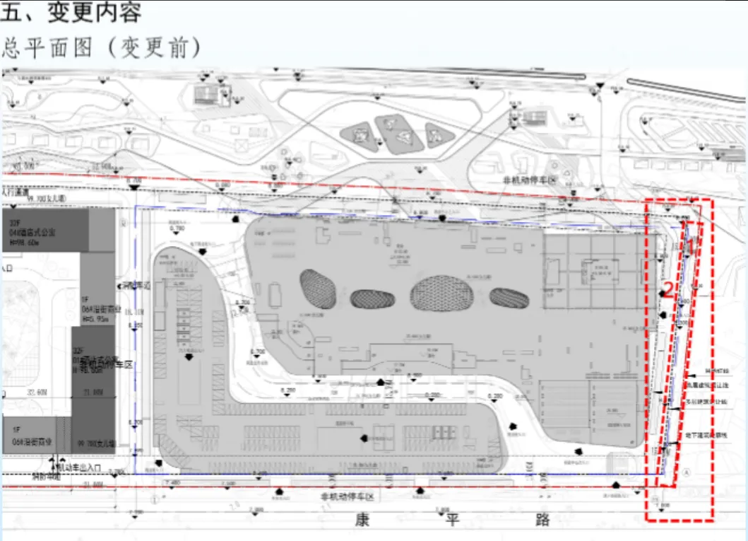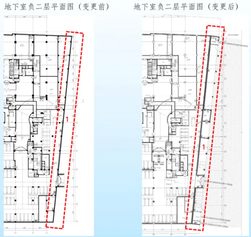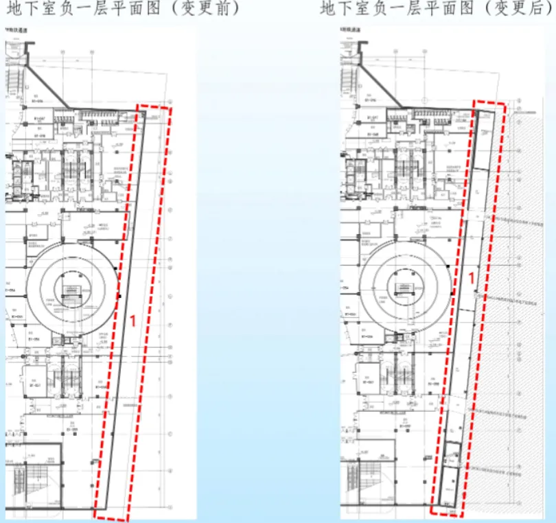 1、按照地块城市设计及原出让合同相关要求,并在取得东侧地块产权人同意的基础上,地块地下一层、地下二层地下室东扩与东侧用地整体开发,地下室轮廓线调整;
