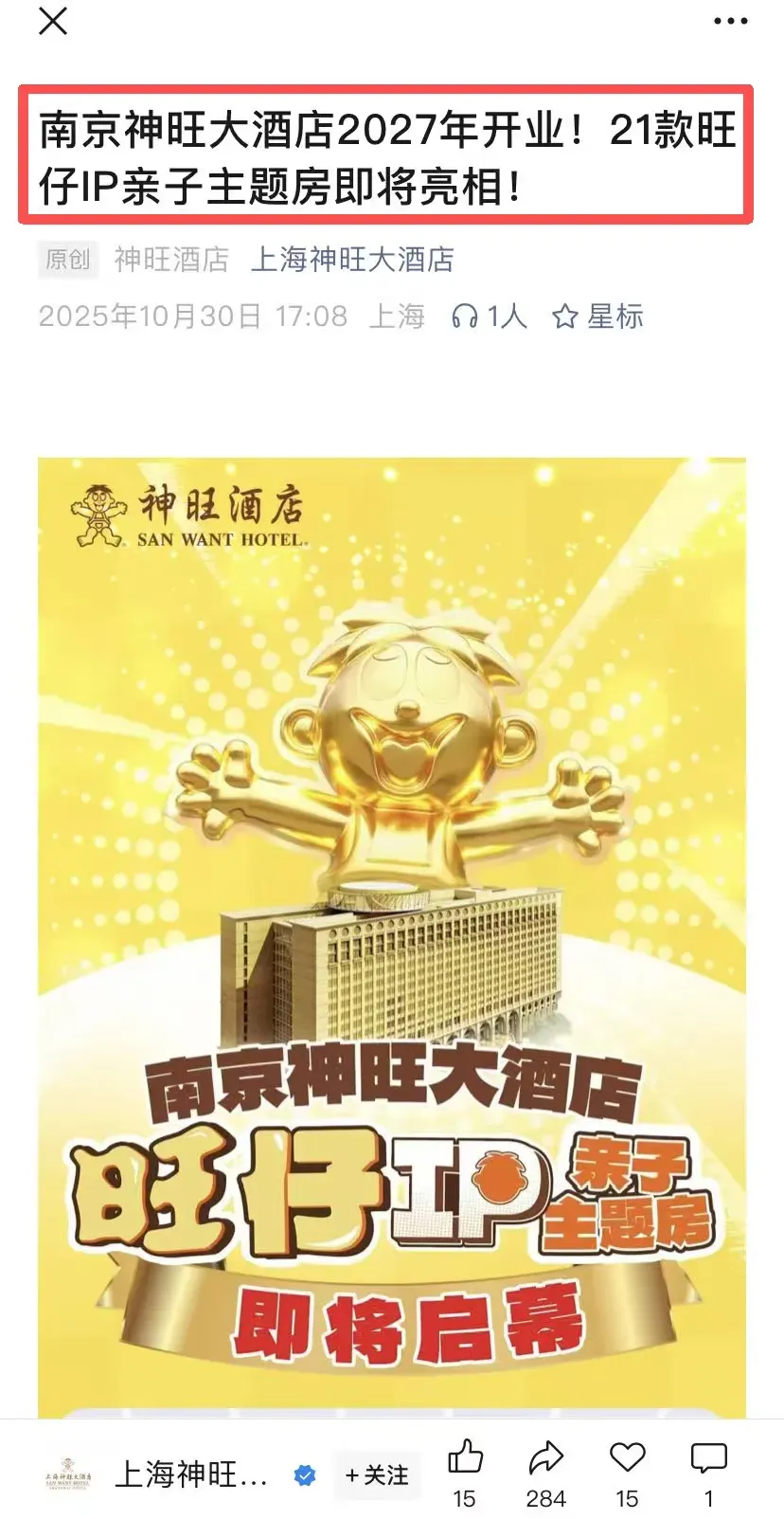 去年,神旺大酒店传来正式复活的消息!其官微发布消息:南京神旺大酒店将于2027年正式开业!并且还详细曝光了内部装修,将打造21款旺仔IP亲子主题房!