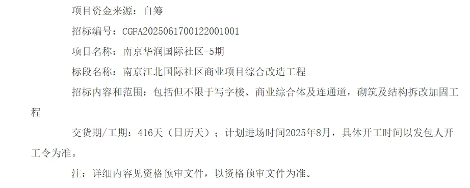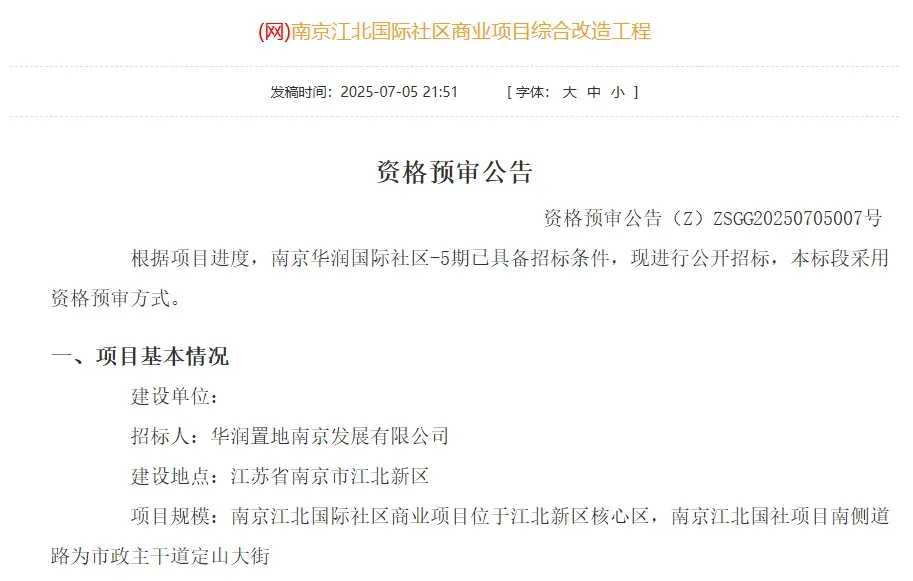 去年7月,华润置地南京发展有限公司发布《南京江北国际社区商业项目综合改造工程》招标公告,官宣下月就开工。