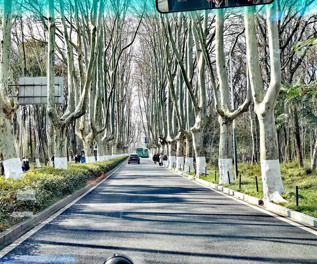 坐在观光车上,因视觉受限,很遗憾未能拍出梧桐大道的神韵。