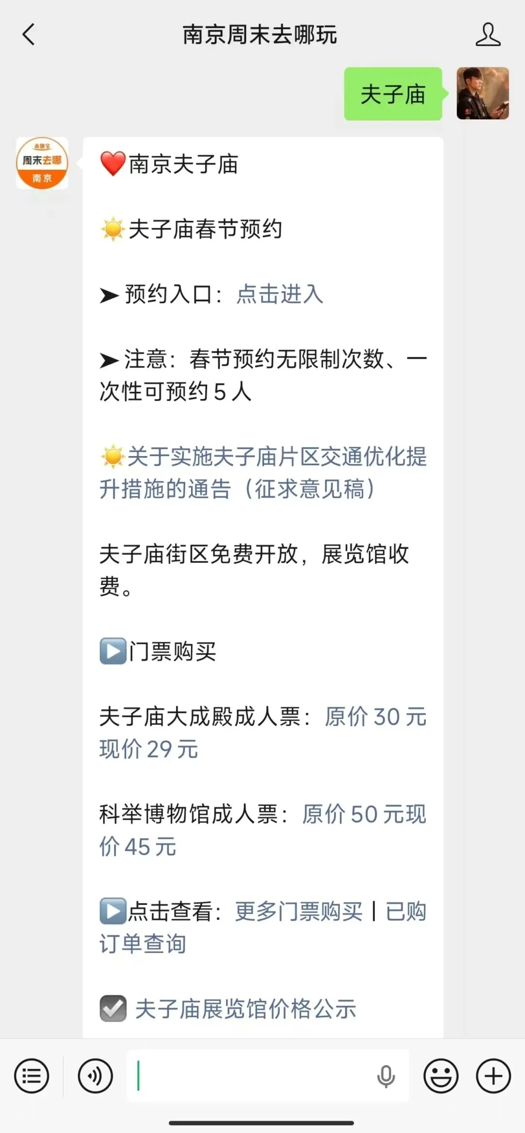 或者扫描下方二维码,关注【南京周末去哪玩】公众号,私信回复【夫子庙】即可获取预约入口