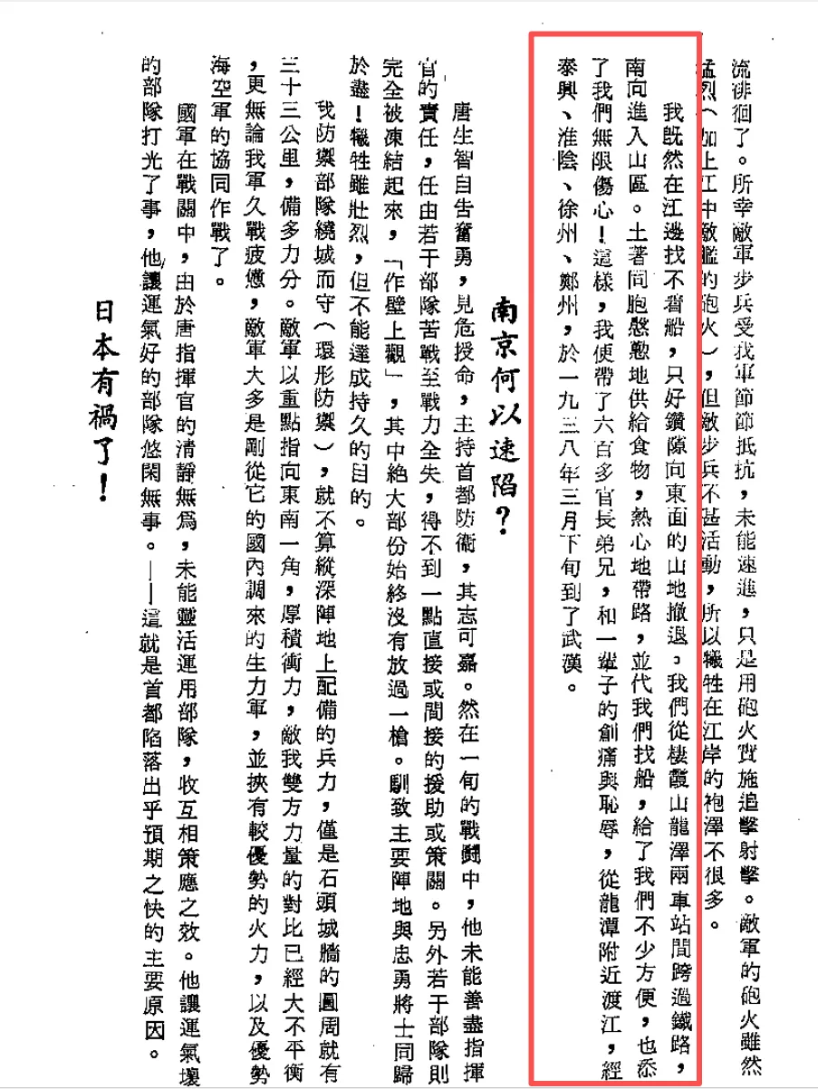 我便带了我的司令部六百多官长兄弟,和一辈子的创痛与耻辱,从龙潭附近渡江,经泰兴、淮阴、徐州、郑州,于1938年3月下旬到了武汉