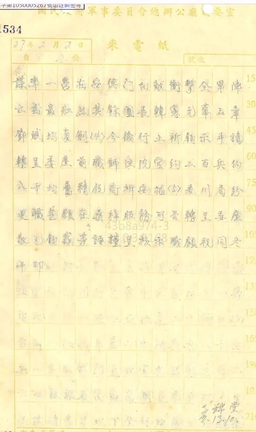“武昌委员长蒋:据韩厅长德勤转据孙元良艳电称规密(1)