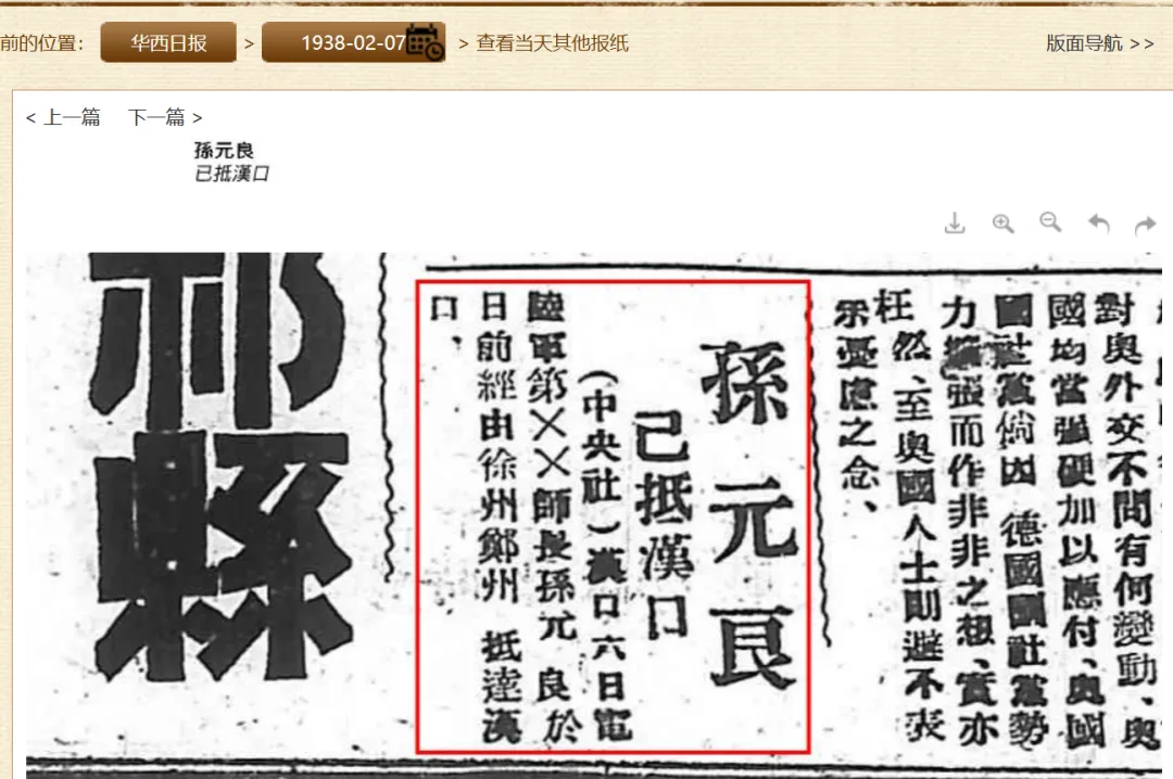 另查当时报纸,1938年2月7日,各报纷纷报道:(中央社)汉口六日电,陆军第**师师长孙元良日前经由徐州郑州抵达汉口。