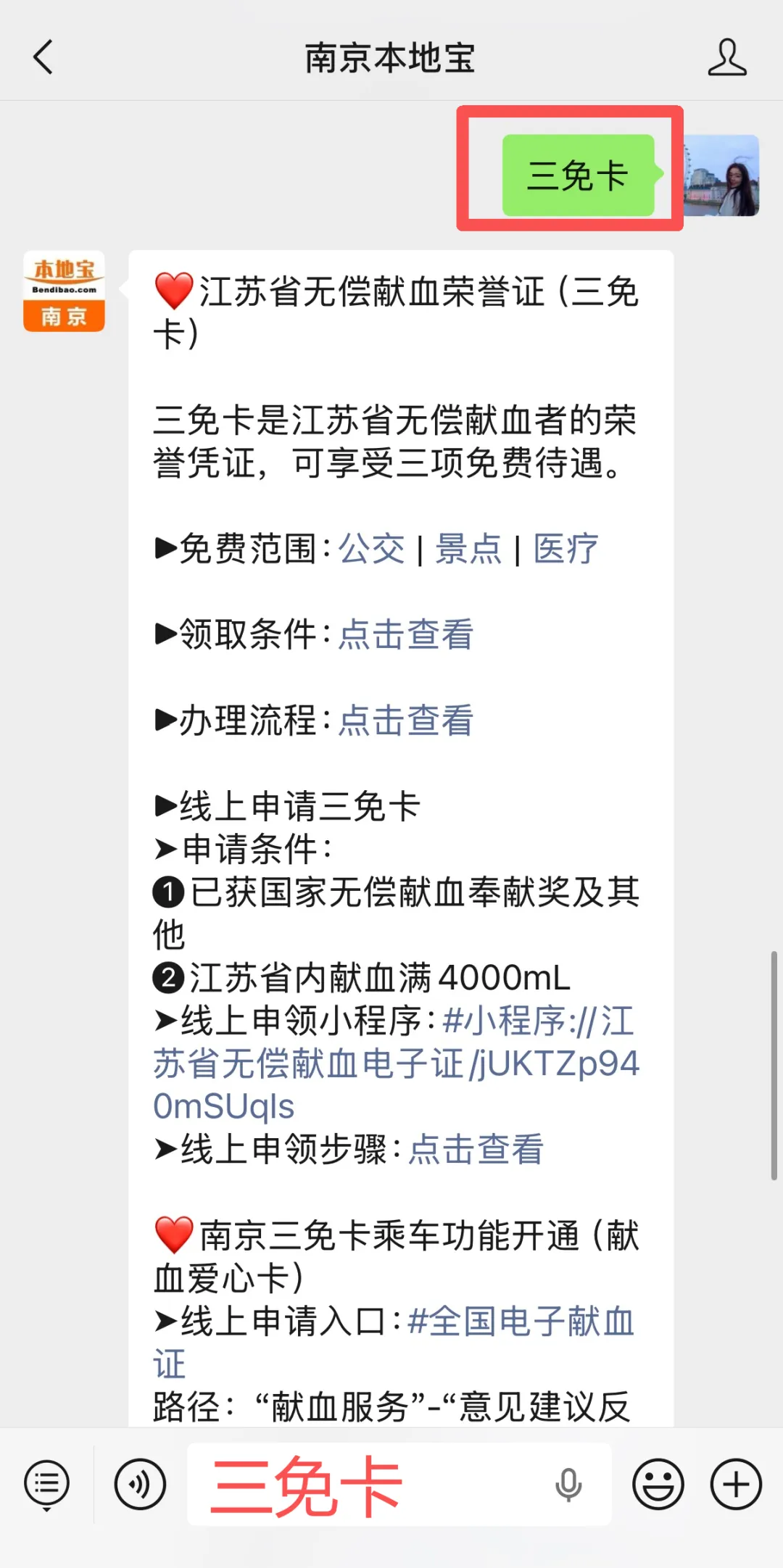或者关注南京本地宝,后台对话框回复【三免卡】获取申请入口,申请指南、江苏省三免卡权益汇总、江苏省电子献血证。