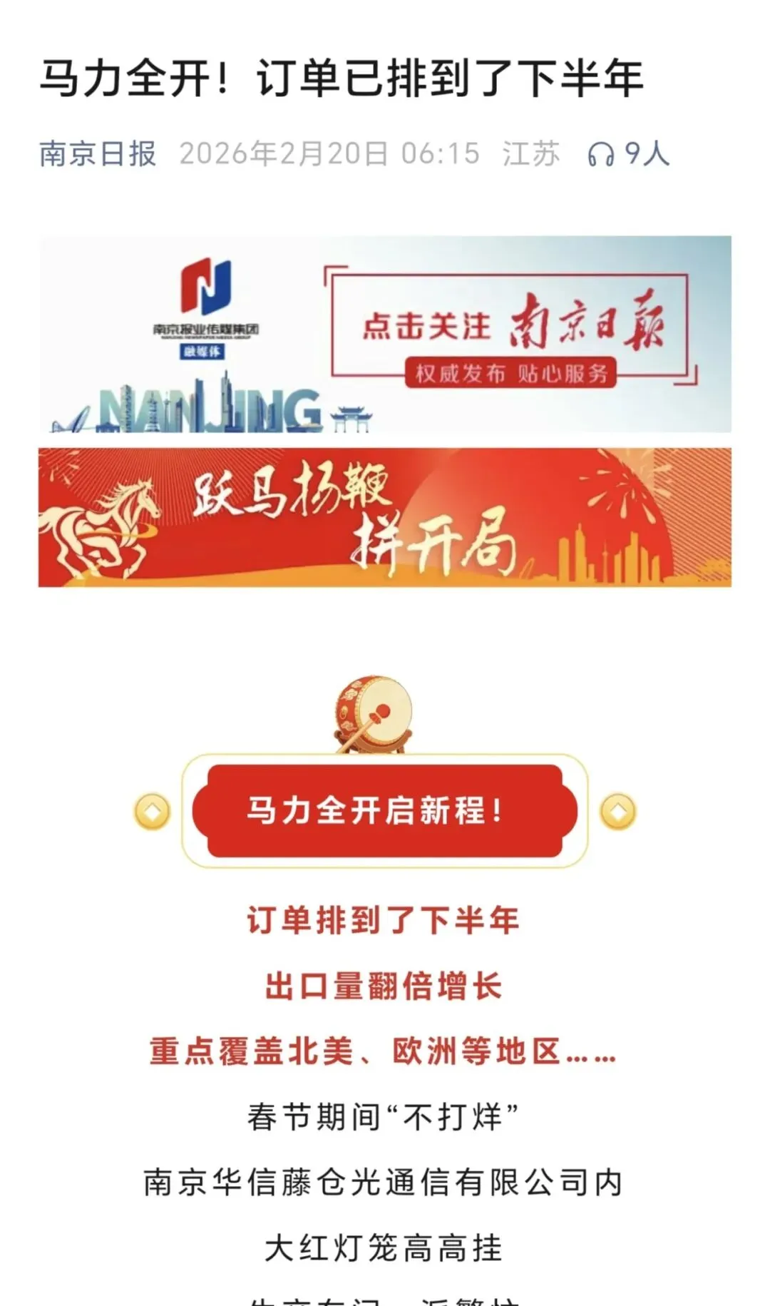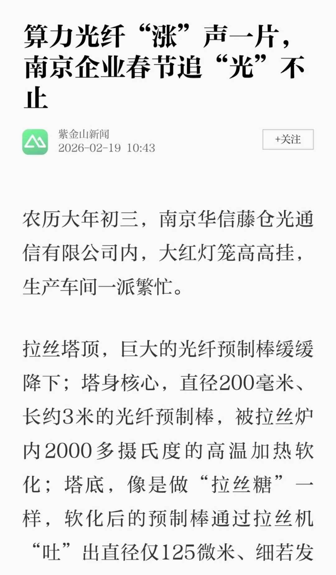 2026年2月正值新春佳节,2月19日紫金山新闻刊发《算力光纤“涨”声一片,南京企业春节追“光”不止》,2月20日南京日报刊发《马力全开!订单已排到了下半年》,文章报道了在南京聚力打造“1026”先进制造业集群体系、打造国家人工智能创新应用先导区“南京升级版”的版图中,南京华信藤仓公司以“满格”状态跑出加速度,以光纤串联起算力时代的“黄金通道”。