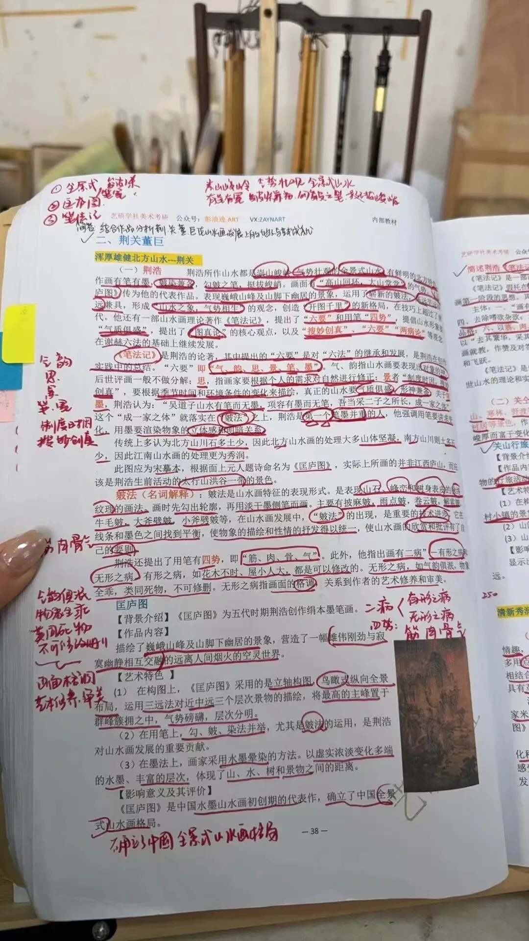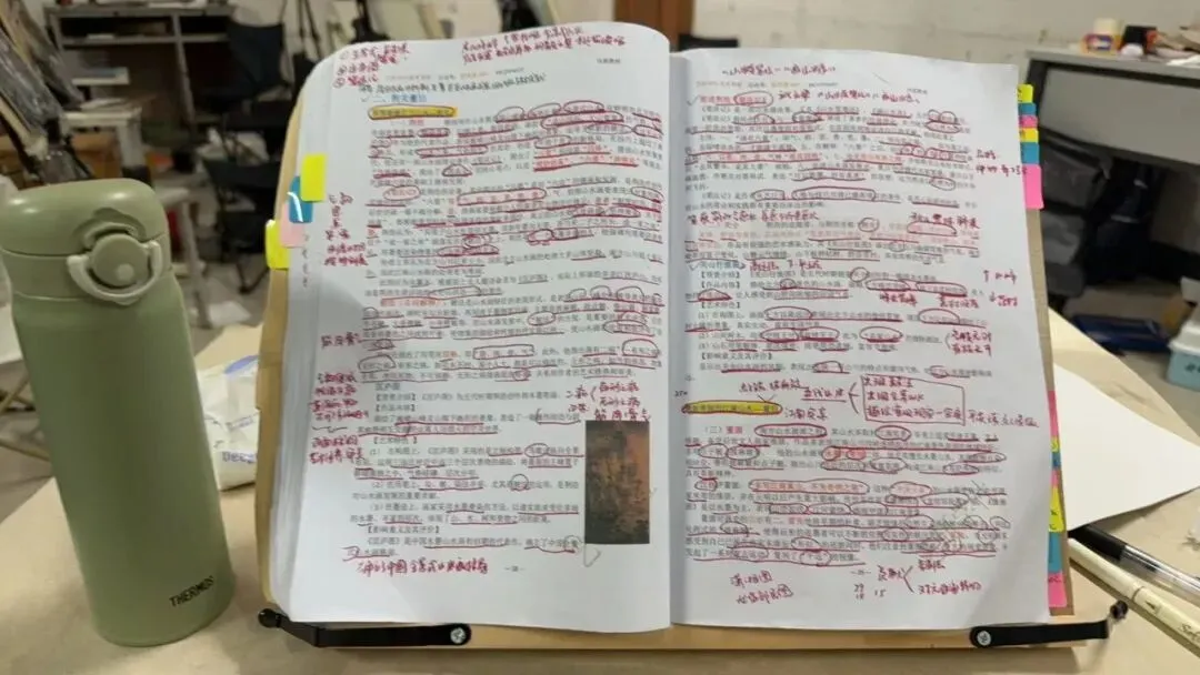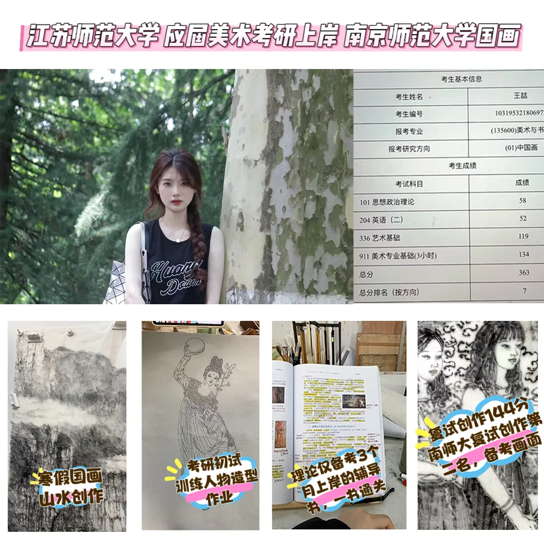 大家好,我是吉吉学姐,报考的是南京师范大学国画方向,本科就读于江苏师范大学国画方向,考研最终选择南京师范大学国画专业,考研的过程不太紧张。大部分时间都花在专业课绘画和学校的课程作业上,理论真算起来9月底才开始背,就背了彭浪迹机构的资料,考的都是我会的,运气很好。 南师大对于绘画要求很高,初试今年该考题就是为了让造型不好的同学不至于投机取巧,复试也很公平,复试144分专业第二名逆袭上岸。以下是考研的成绩单以及考研期间的画面。理论跟着机构的祁老师,在资料的基础上梳理知识,我背书的时间很短,属于理解透彻为主,祁老师也是南京师范大学的美术学博士,讲的很详细,这是我平时跟着课程在书上做的笔记。