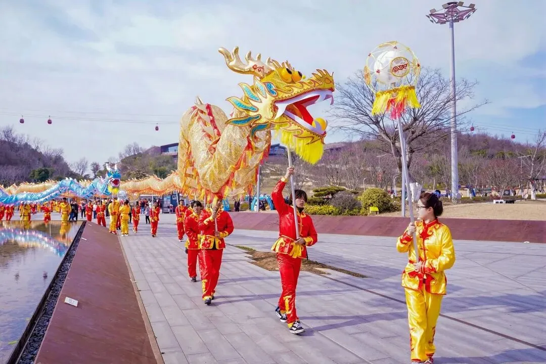 如果你春节来了汤山,大概率会被那扑面而来的声势“撞”个满怀。这是江苏最大的新春舞龙巡游,两条百米长龙——一黄一青,寓意着汤山的黄龙山脉与青龙山脉,从江苏园博园奔腾而出。它们不是在表演,而是在“呼吸”。伴随着锣鼓与唢呐的民乐节奏,长龙在园博园的主路上演“二龙戏珠”,鳞片在冬阳下闪着光,龙身拂过游客的眉梢。