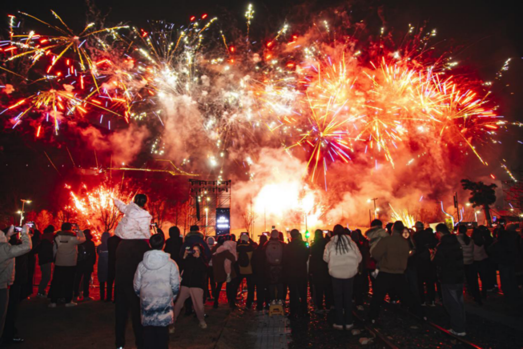 地上火龙翻腾,空中铁花飞溅,天边烟花璀璨——三重光影交织,仿佛千年前的年兽也为此驻足。在篝火晚会的映照下,古老碑材的剪影与现代人的欢颜,奇迹般地融为了一体。