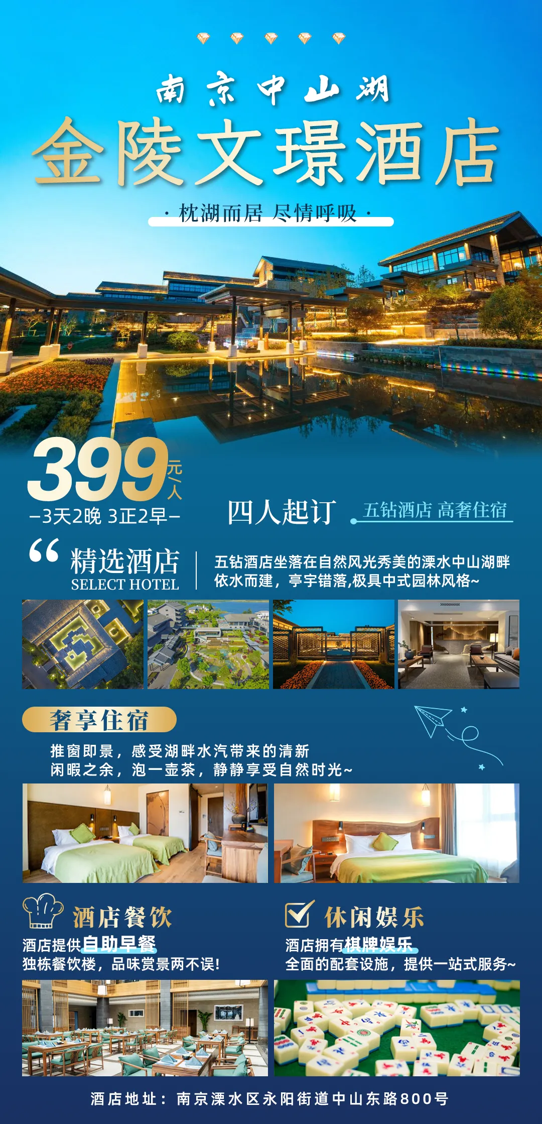 南京五钻【中山湖金陵文璟酒店】高铁站免费接送!399元每人,3天2晚3正2自助早餐!享棋牌娱乐!避暑胜地,夏日里的一抹清新~