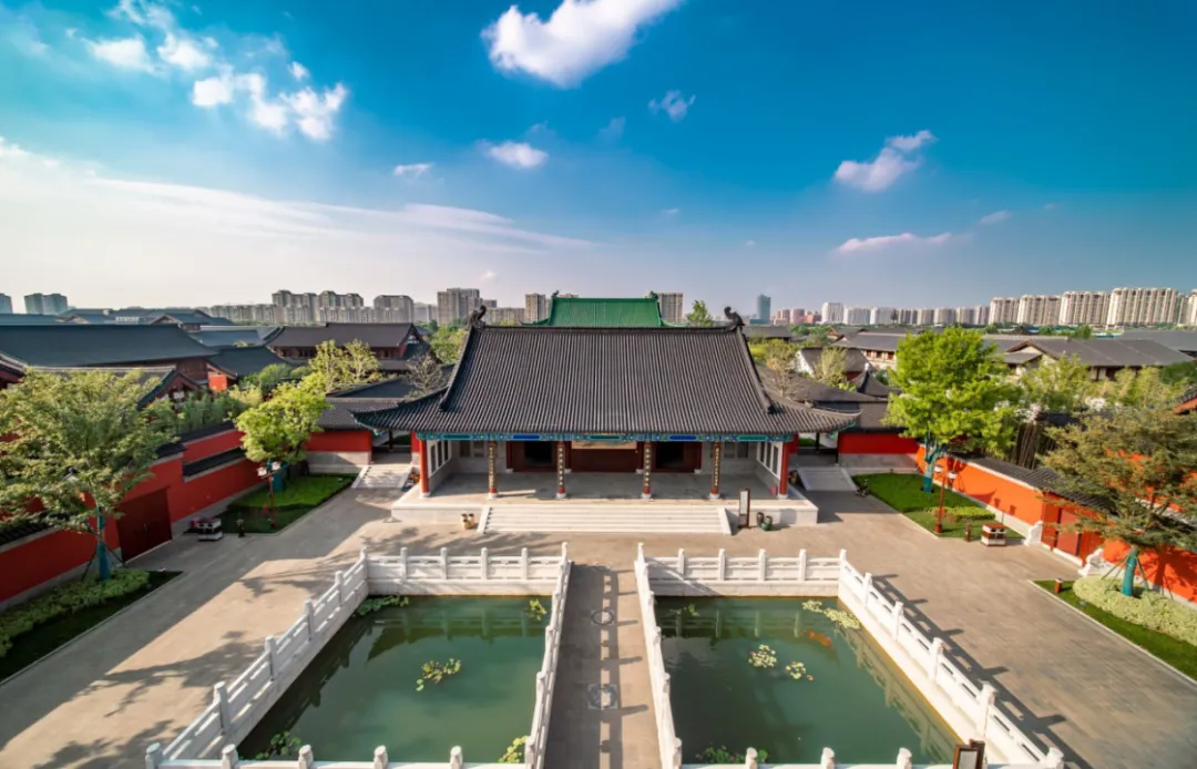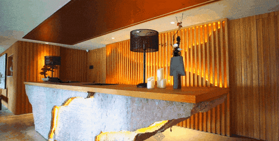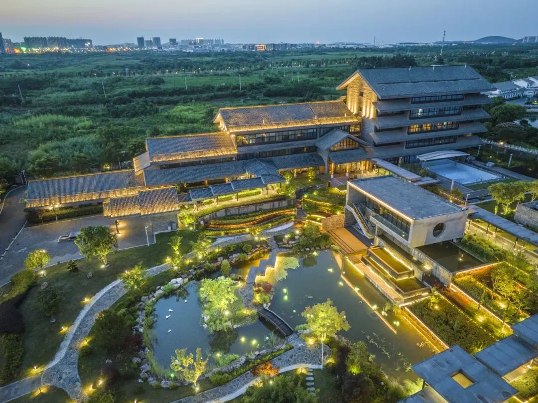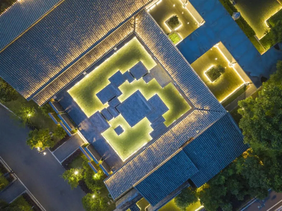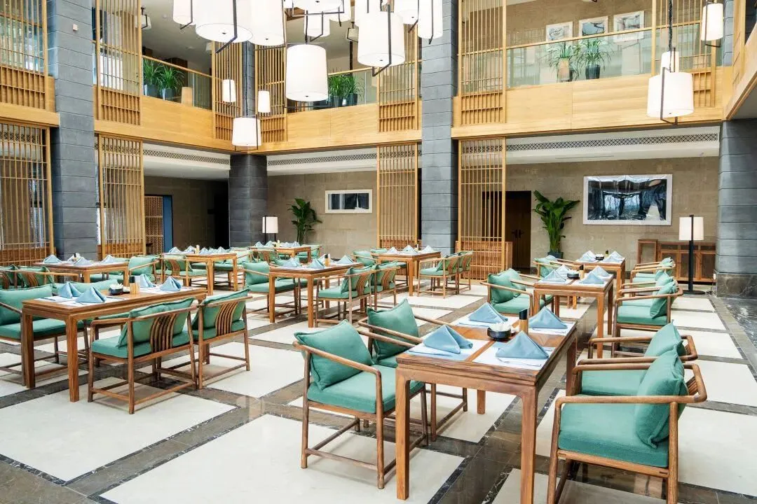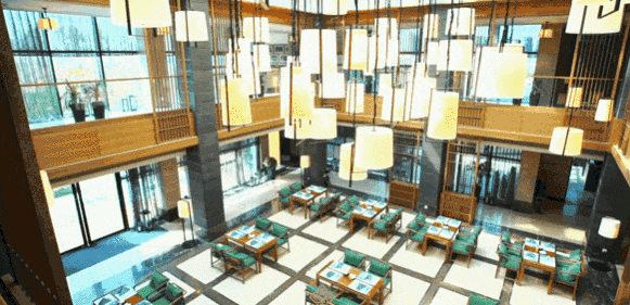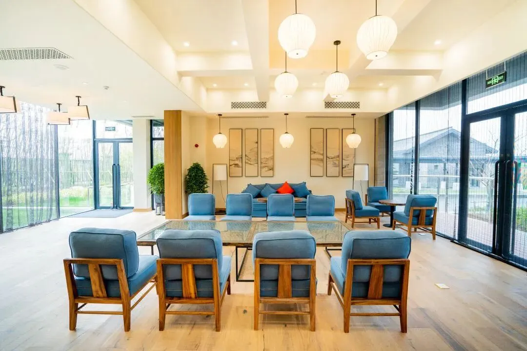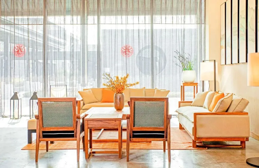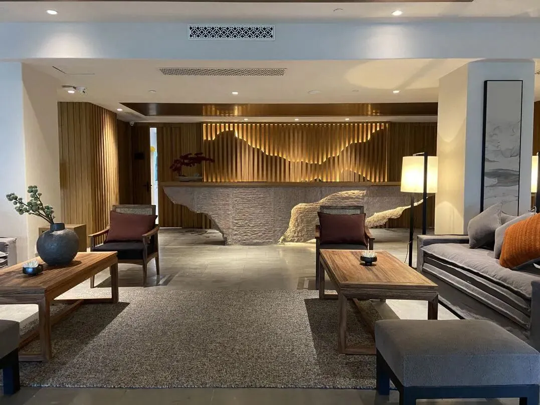 酒店大堂的橘白色调,同中式建筑的简约古朴交相辉映