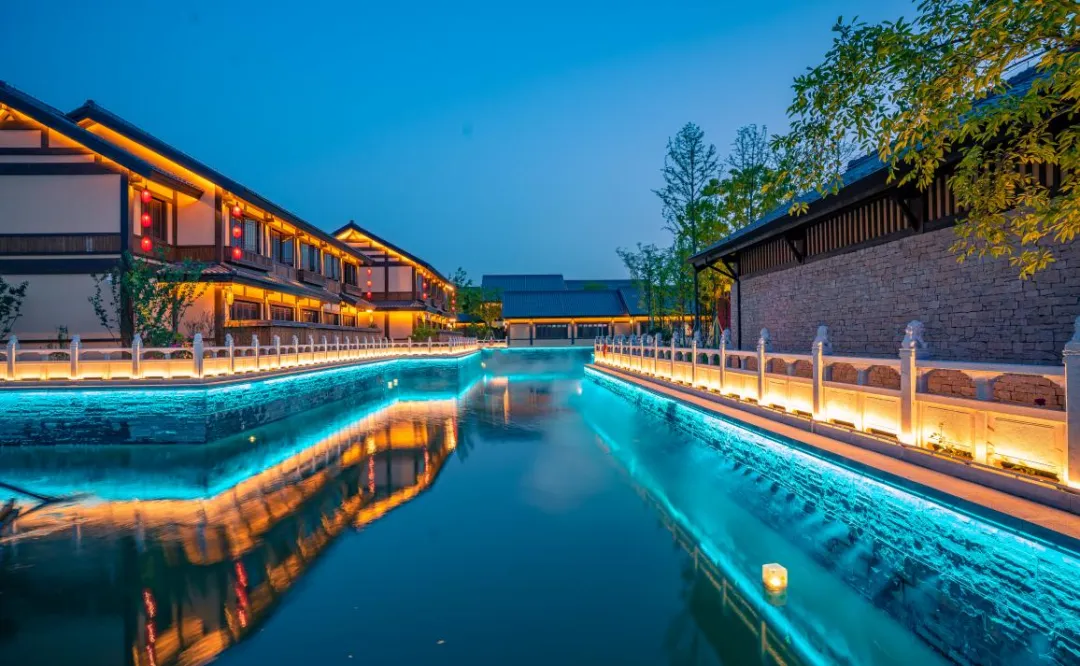 整体风格自然柔和,白天流水潺潺、秀美雅致