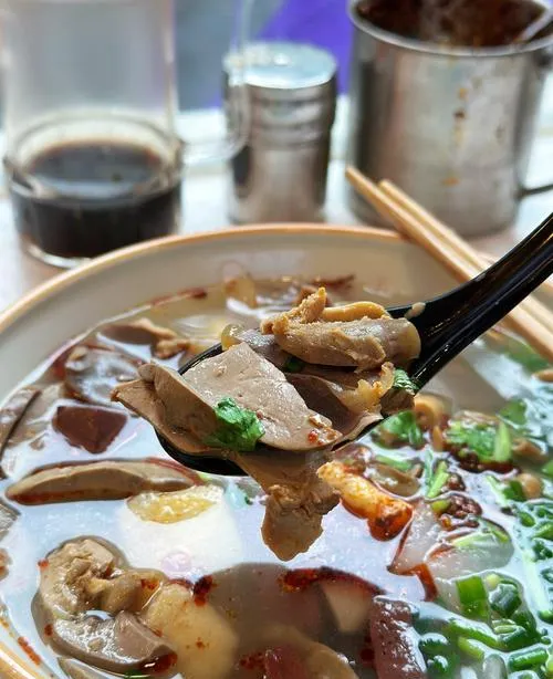 鸭血、鸭肠、鸭肝等材料加入鸭汤和粉丝