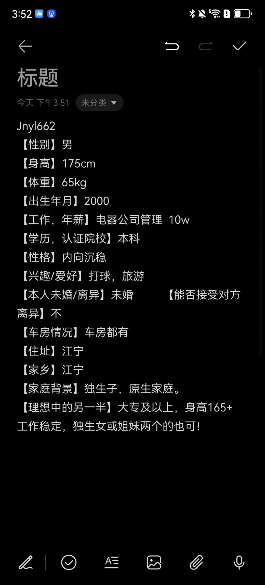 南京相亲丨89年,男,南京有房有车,年薪25万以上,本科学历